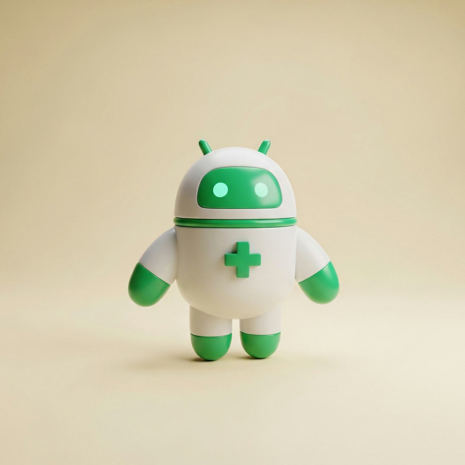 A cute 3D robot with a white and green design, featuring a medical cross on its chest, standing against a neutral background.