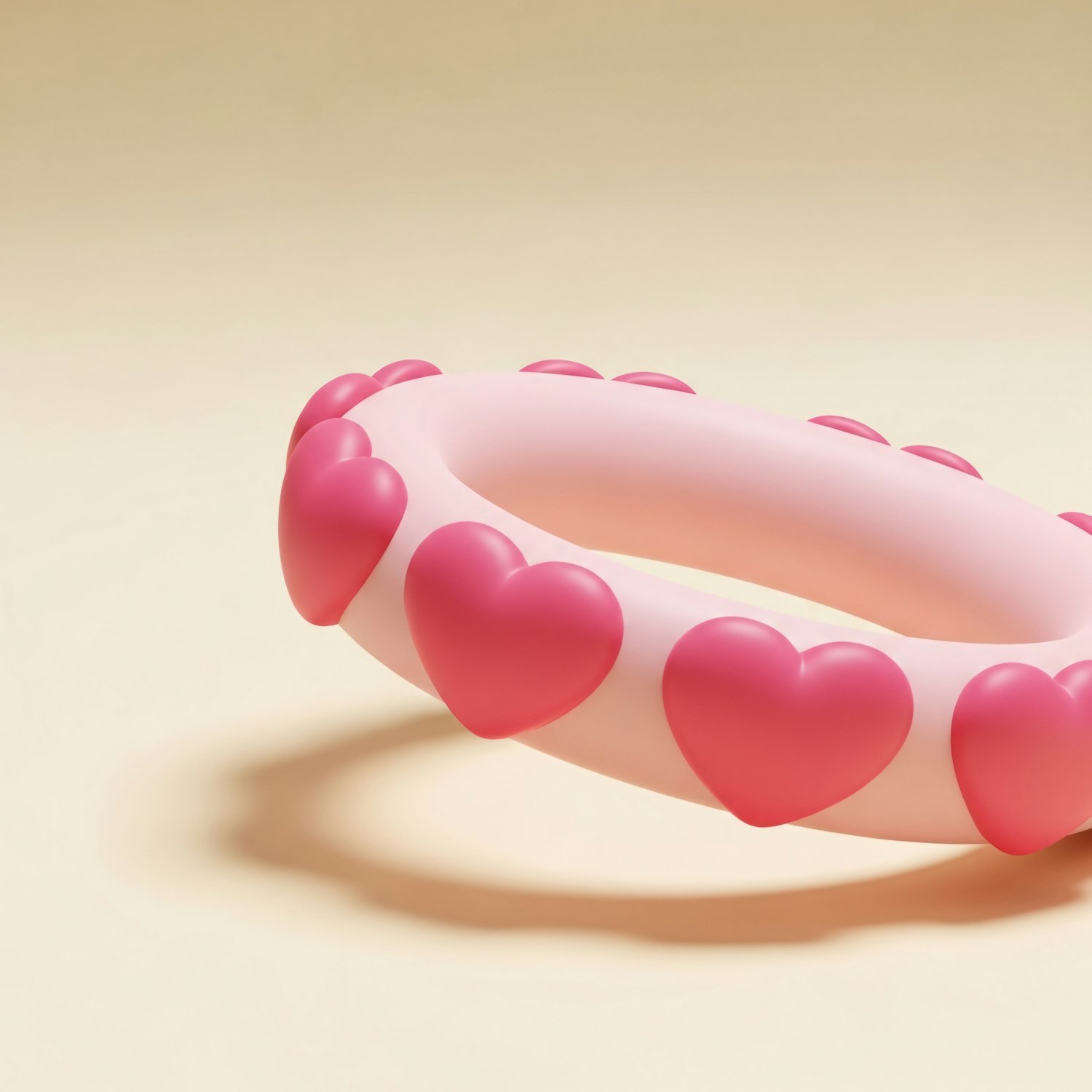 A pink circular object with red heart accents on a beige background, showcasing a playful and romantic design.