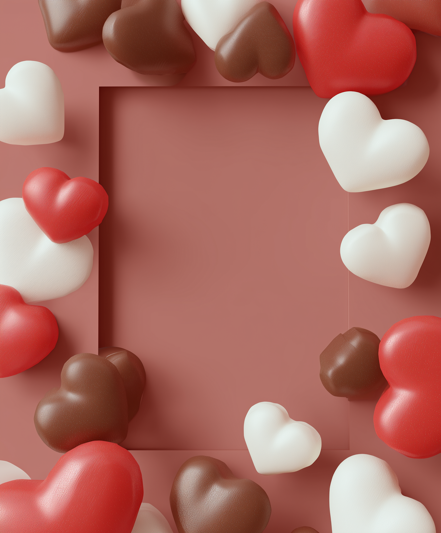 A charming arrangement of red, white, and brown 3D hearts on a pink background, perfect for romantic or celebratory themes.