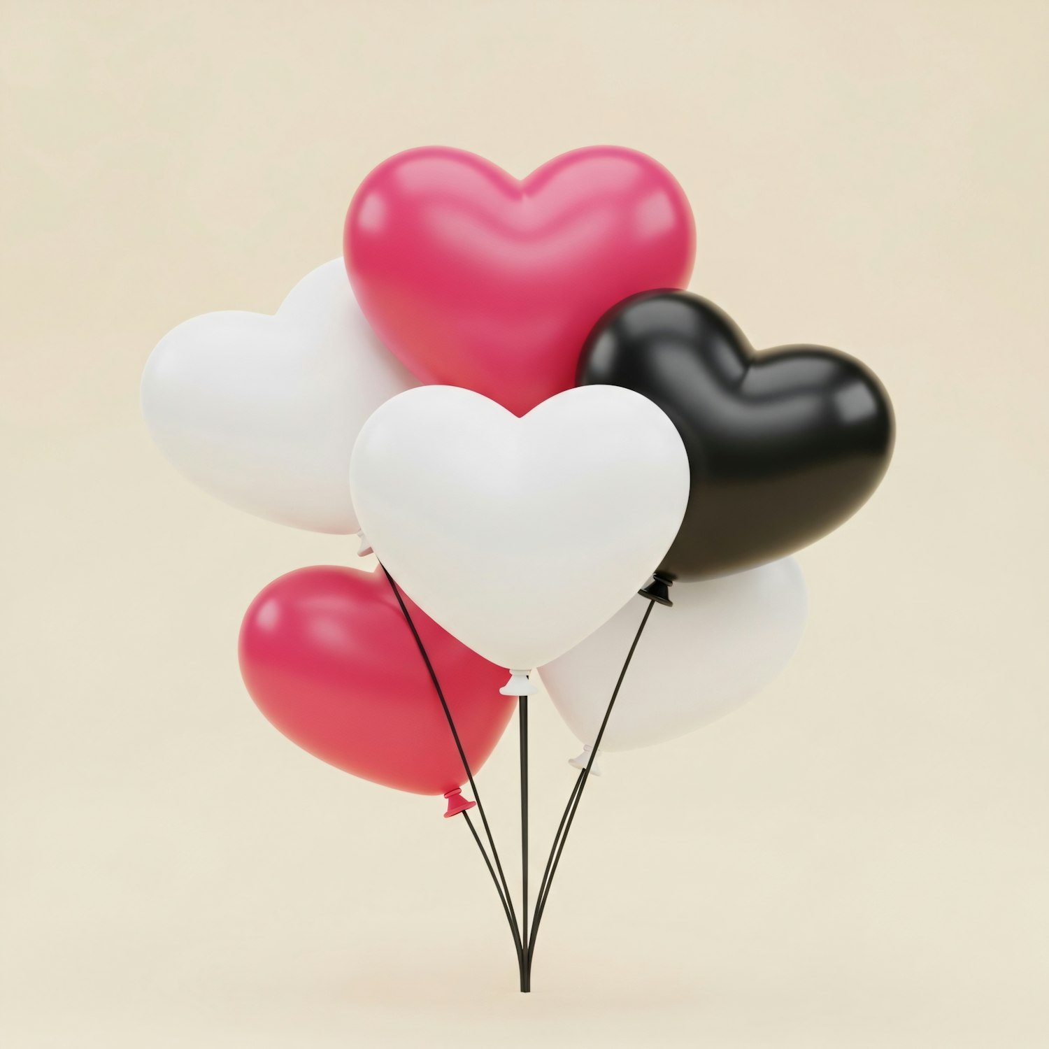 Heart-shaped balloons in red, white, and black with a glossy finish, tied together and floating against a neutral beige background.