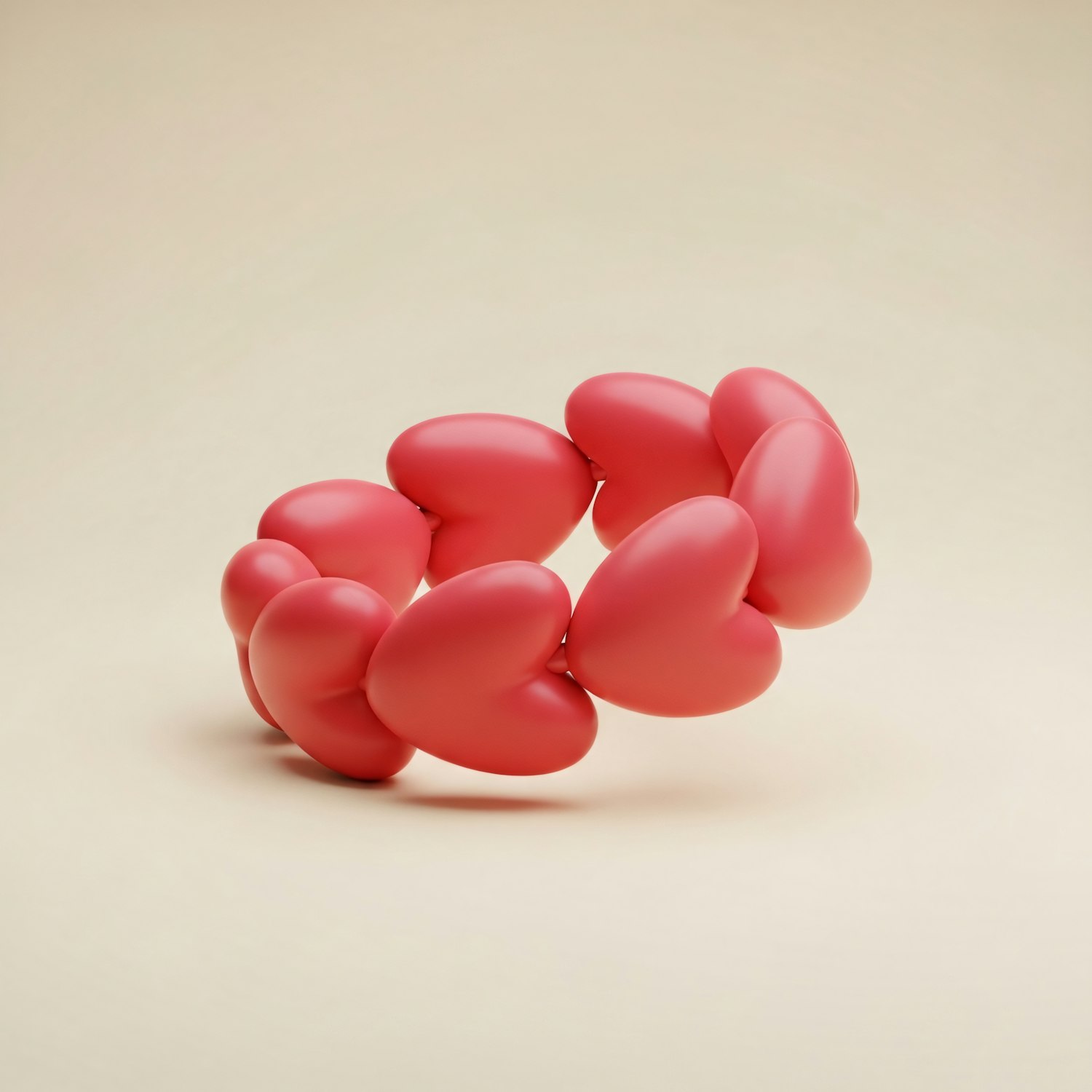 A bracelet made of red heart-shaped elements on a beige background, showcasing a romantic and playful design.