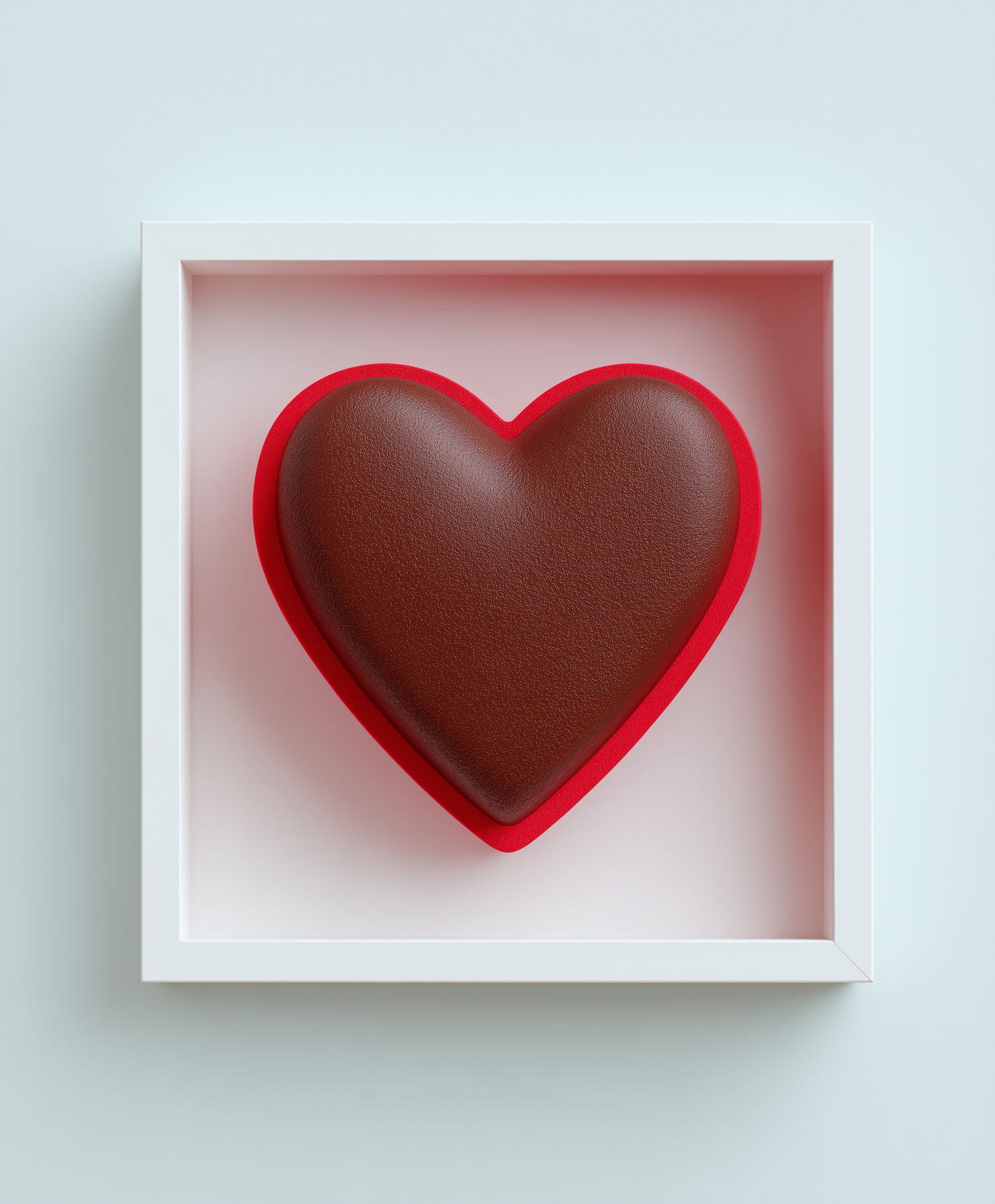 A 3D-rendered heart-shaped chocolate design with a red border, framed in white, set against a soft pastel background.