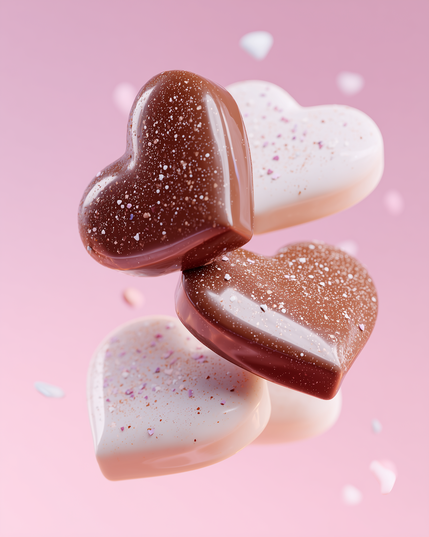 Heart-shaped chocolates in brown and white with speckled patterns, set against a pink background, perfect for a romantic or festive theme.