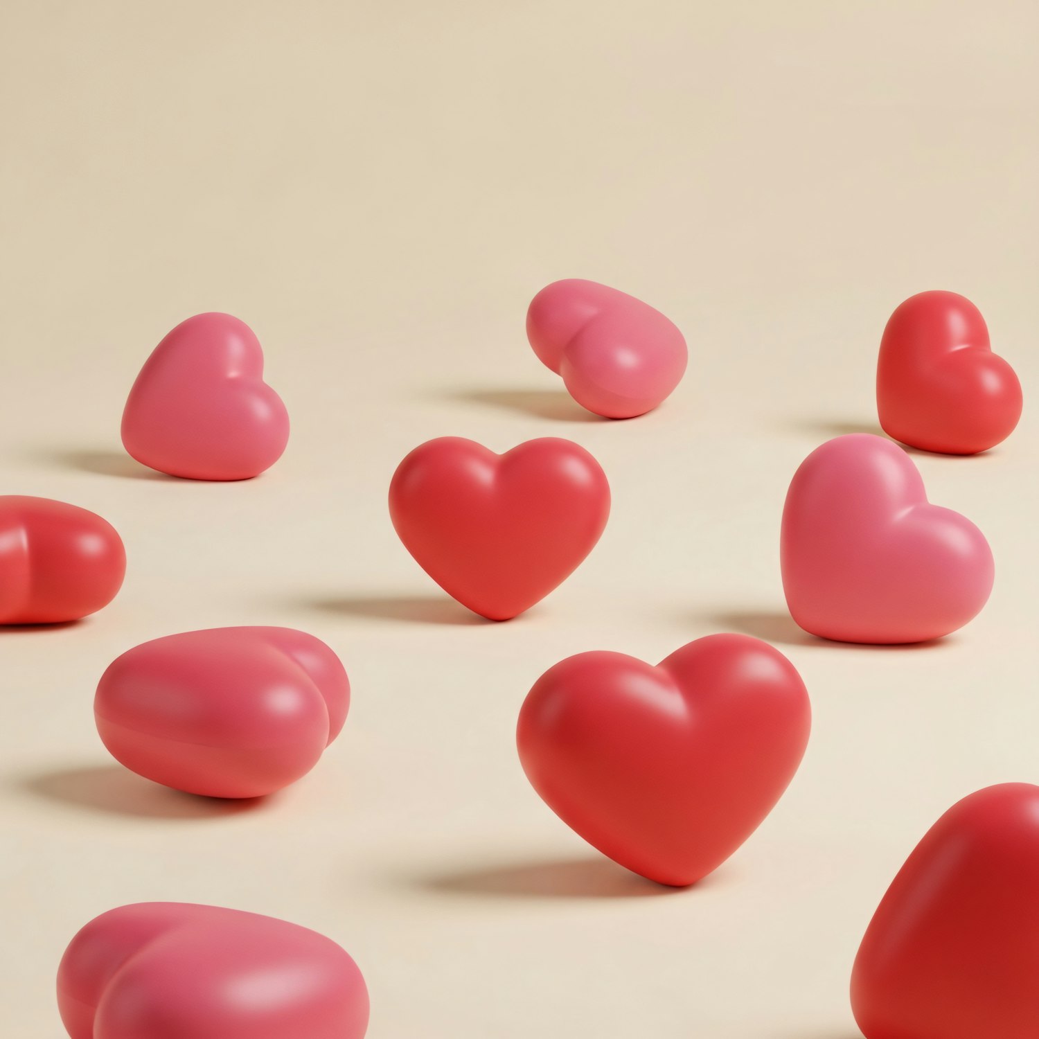 A collection of glossy pink and red heart shapes on a beige background, arranged dynamically for a playful and minimalistic aesthetic.