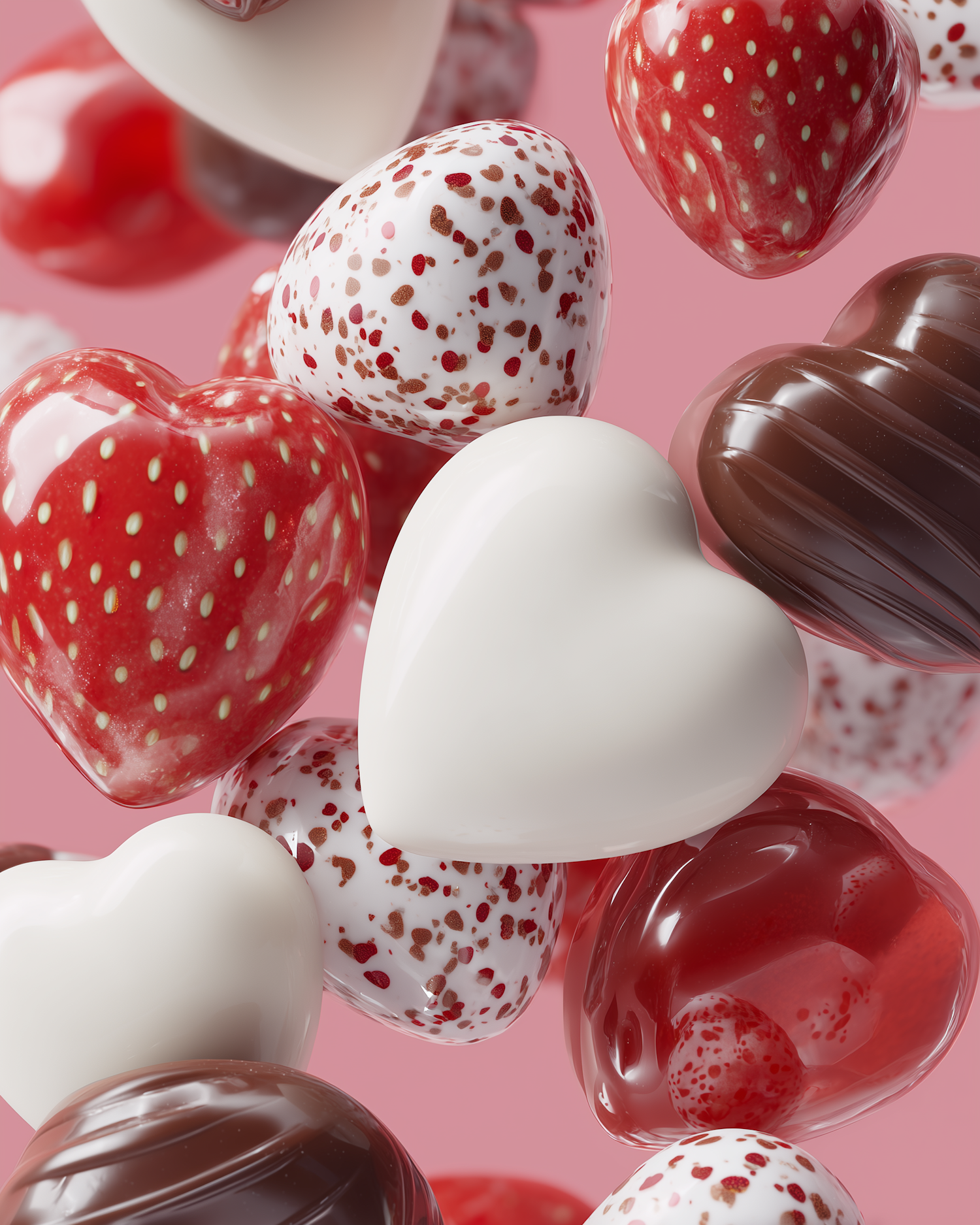 Heart-shaped candies in red, white, and chocolate hues with intricate patterns, set against a pink background, creating a sweet and festive vibe.
