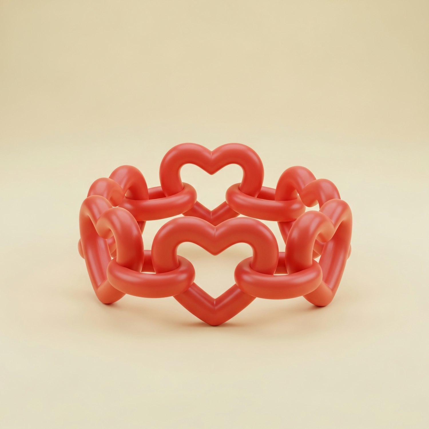 A 3D-rendered bracelet with interlocking red heart-shaped links on a beige background, showcasing a modern and elegant design.