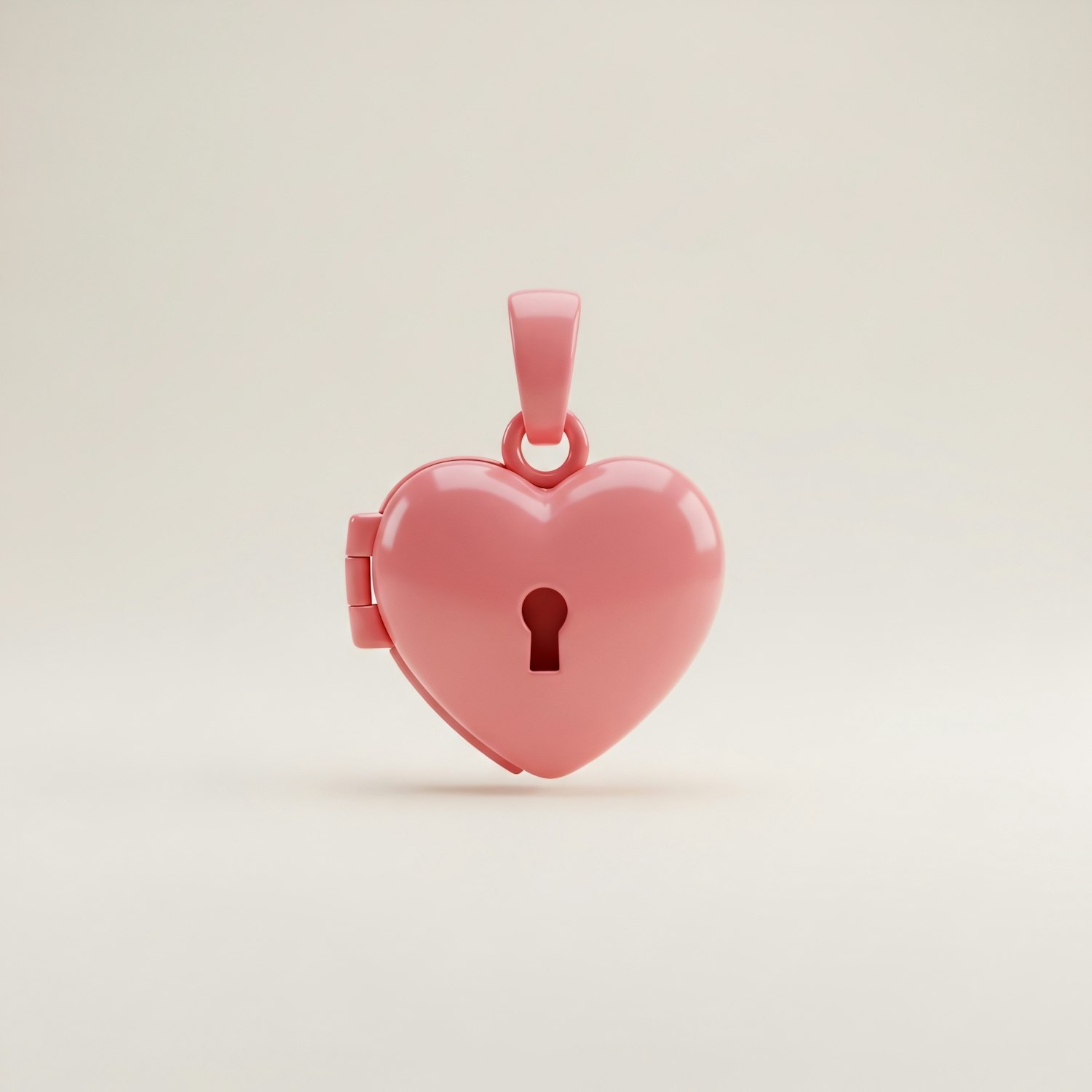A pink heart-shaped locket pendant with a keyhole, set against a neutral background, showcasing its elegant and simple design.