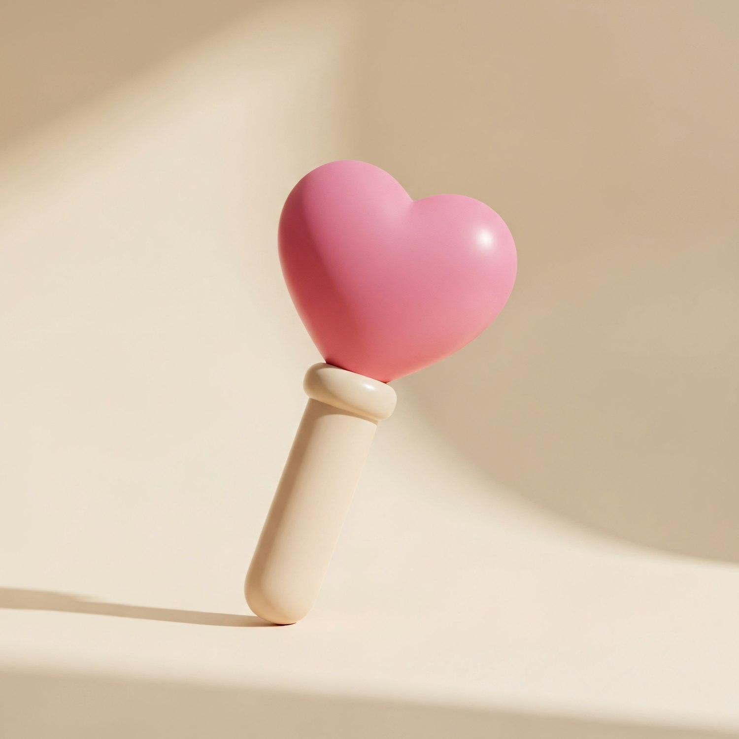 A pink heart-shaped object with a beige handle, set against a soft beige background, creating a minimalistic and elegant composition.