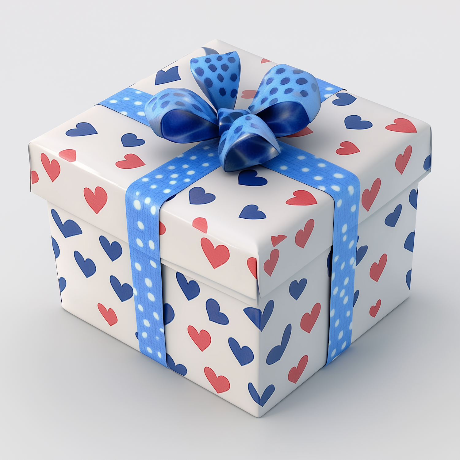 Charming gift box with red and blue heart patterns, tied with a blue polka-dot ribbon. Perfect for romantic occasions or celebrations.