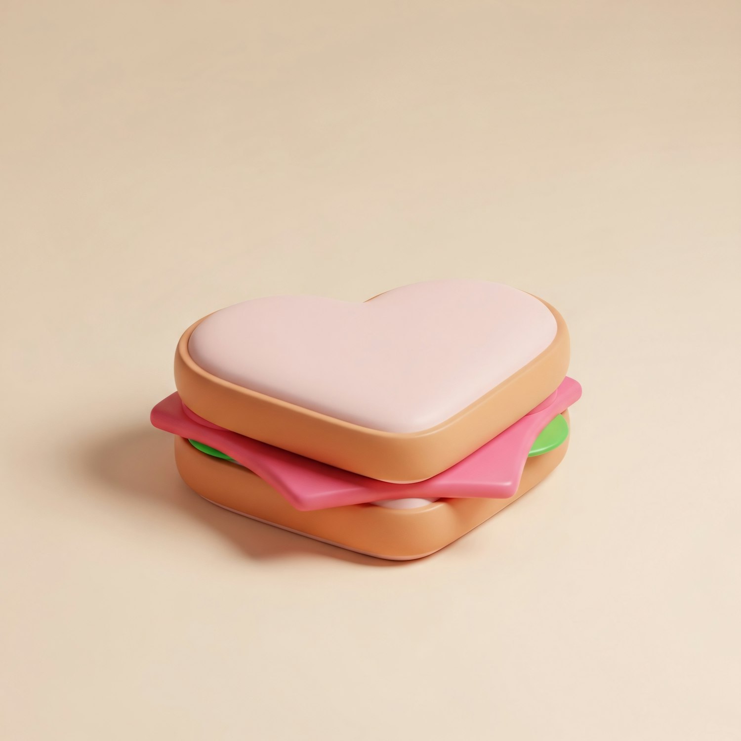 A heart-shaped sandwich with pastel layers on a beige background, blending playful design with soft colors.