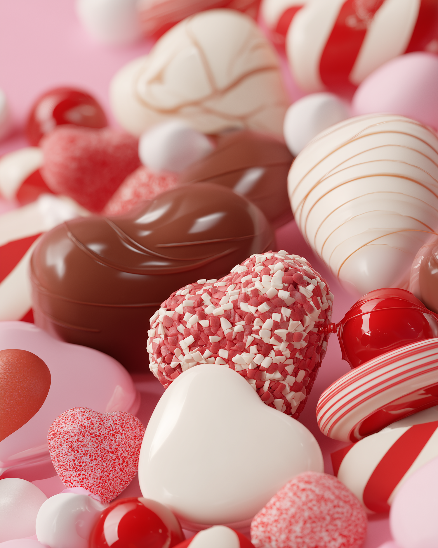 A colorful assortment of heart-shaped candies and chocolates on a pink background, perfect for Valentine's Day or romantic themes.