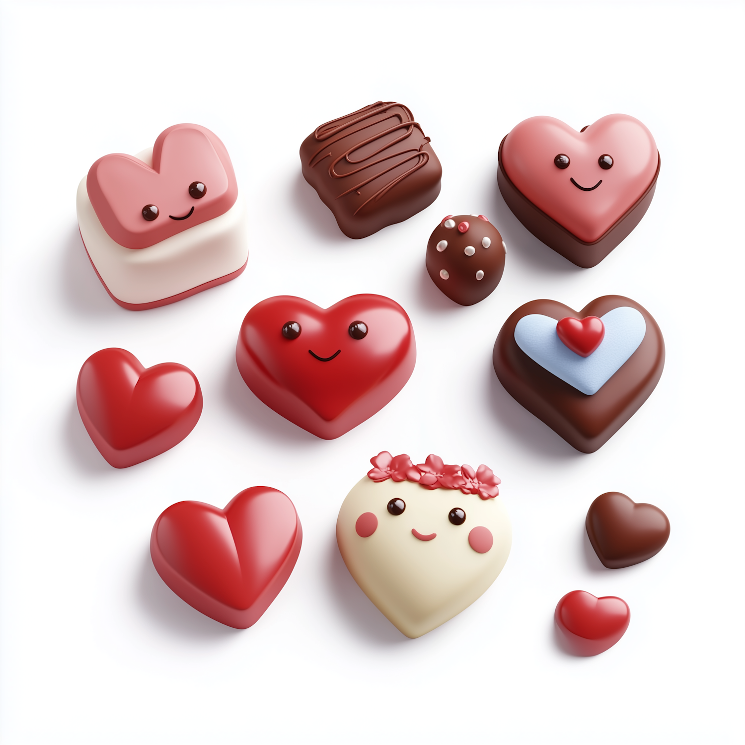 Cute heart-shaped chocolates with smiling faces and floral decorations on a white background. Perfect for Valentine's Day.