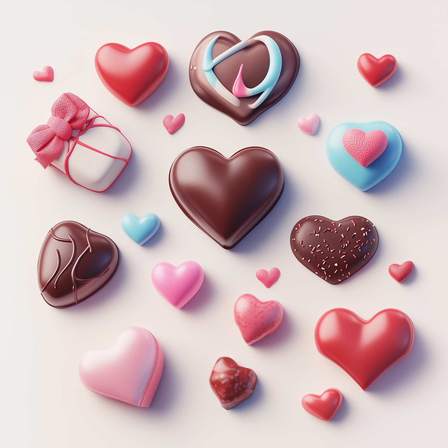 Heart-shaped chocolates and candies in vibrant colors, featuring sprinkles, icing, and a gift-wrapped piece, perfect for Valentine's Day.