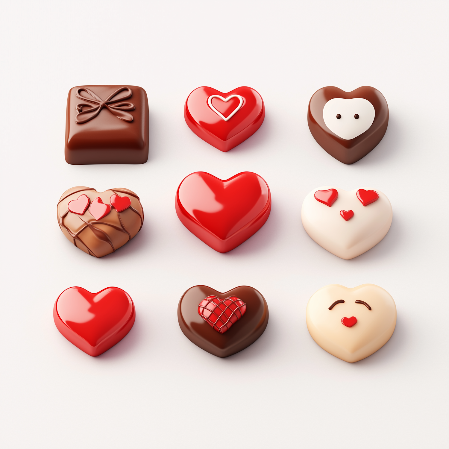 Nine heart-shaped chocolates in various designs and colors, arranged in a grid on a white background. Perfect for Valentine's Day.