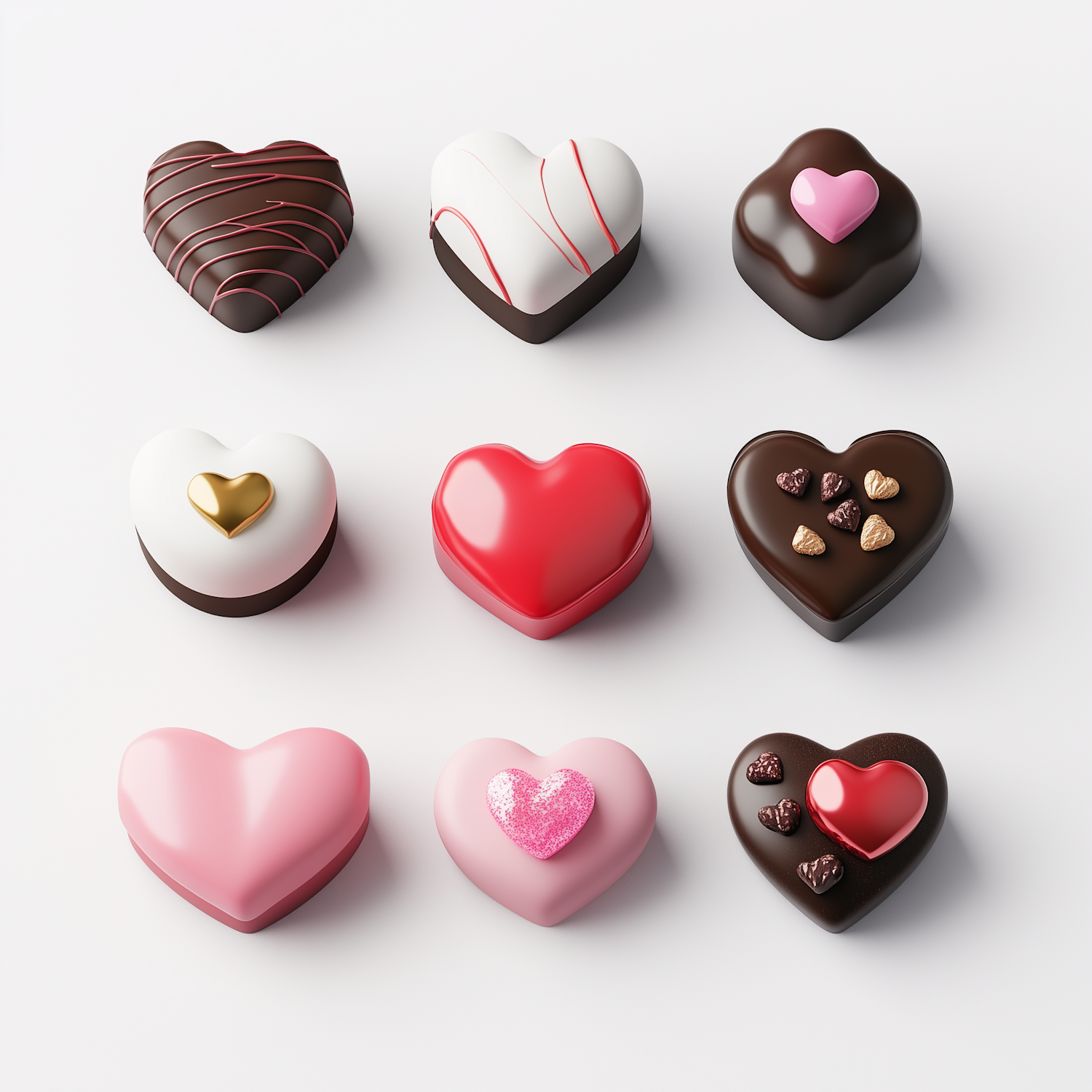 Nine heart-shaped chocolates with unique designs, featuring glossy, matte, and glittery finishes in a 3x3 grid on a white background.