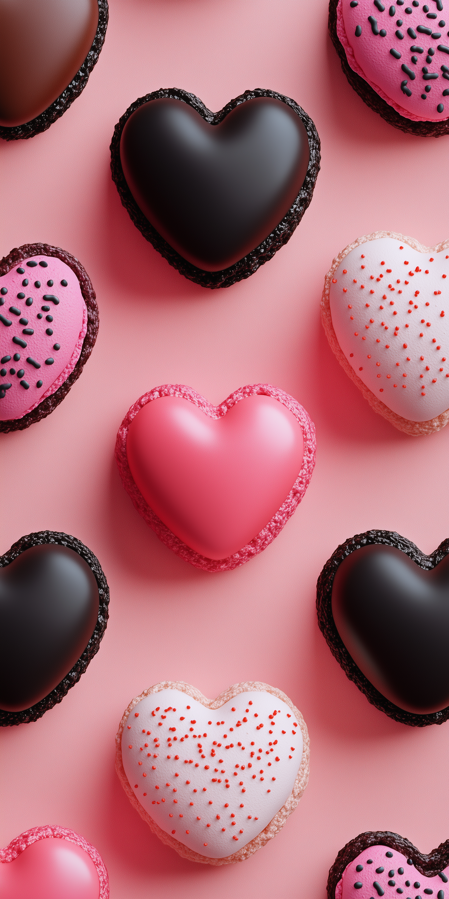 Heart-shaped macarons in chocolate, pink, and white with sprinkles on a pink background, creating a delightful and colorful pattern.