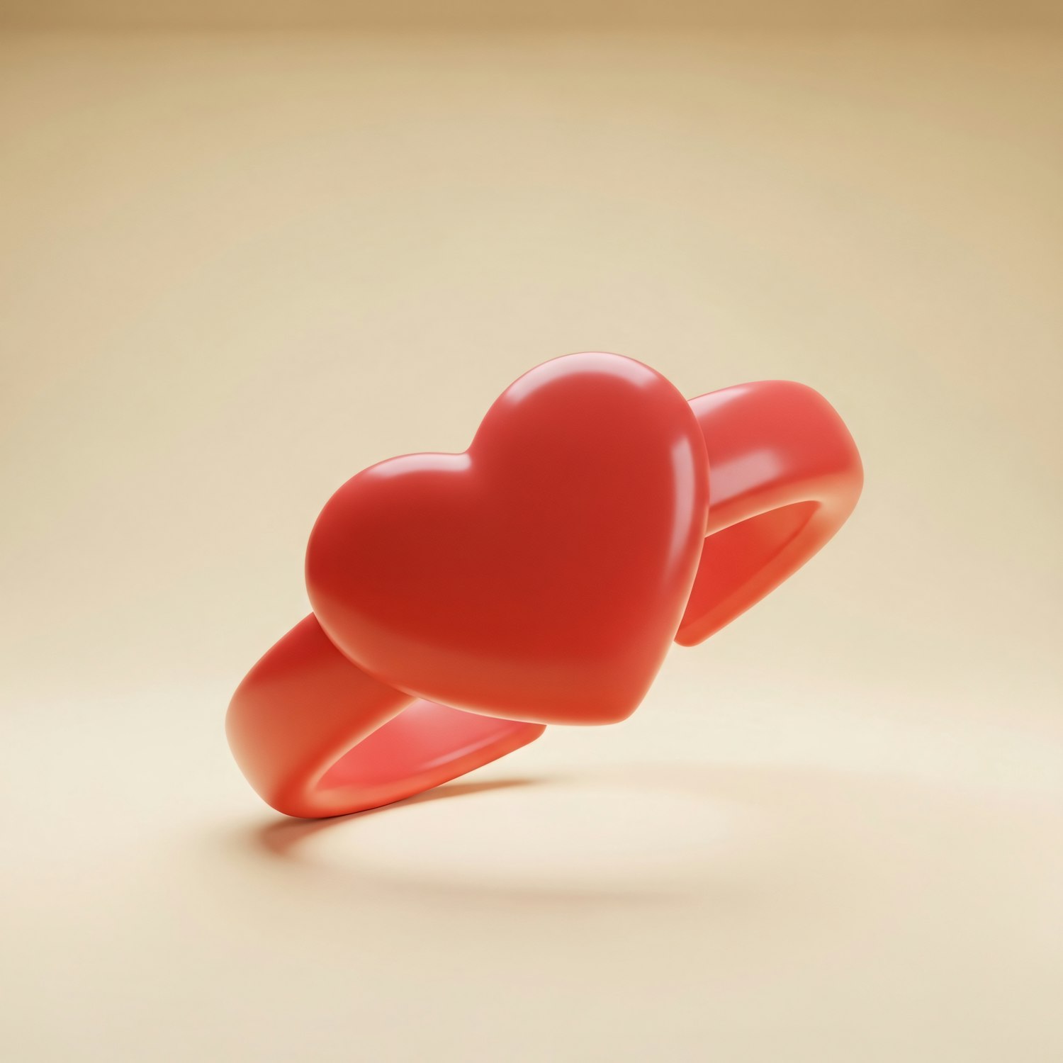 A vibrant red heart-shaped ring with a glossy finish, set against a soft beige background, showcasing its elegant and modern design.