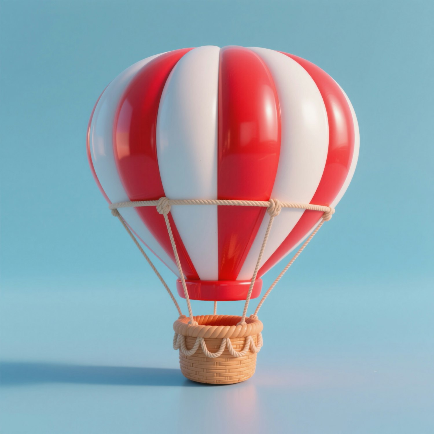 A vibrant 3D-rendered red and white hot air balloon on a light blue background, perfect for whimsical or travel-themed designs.