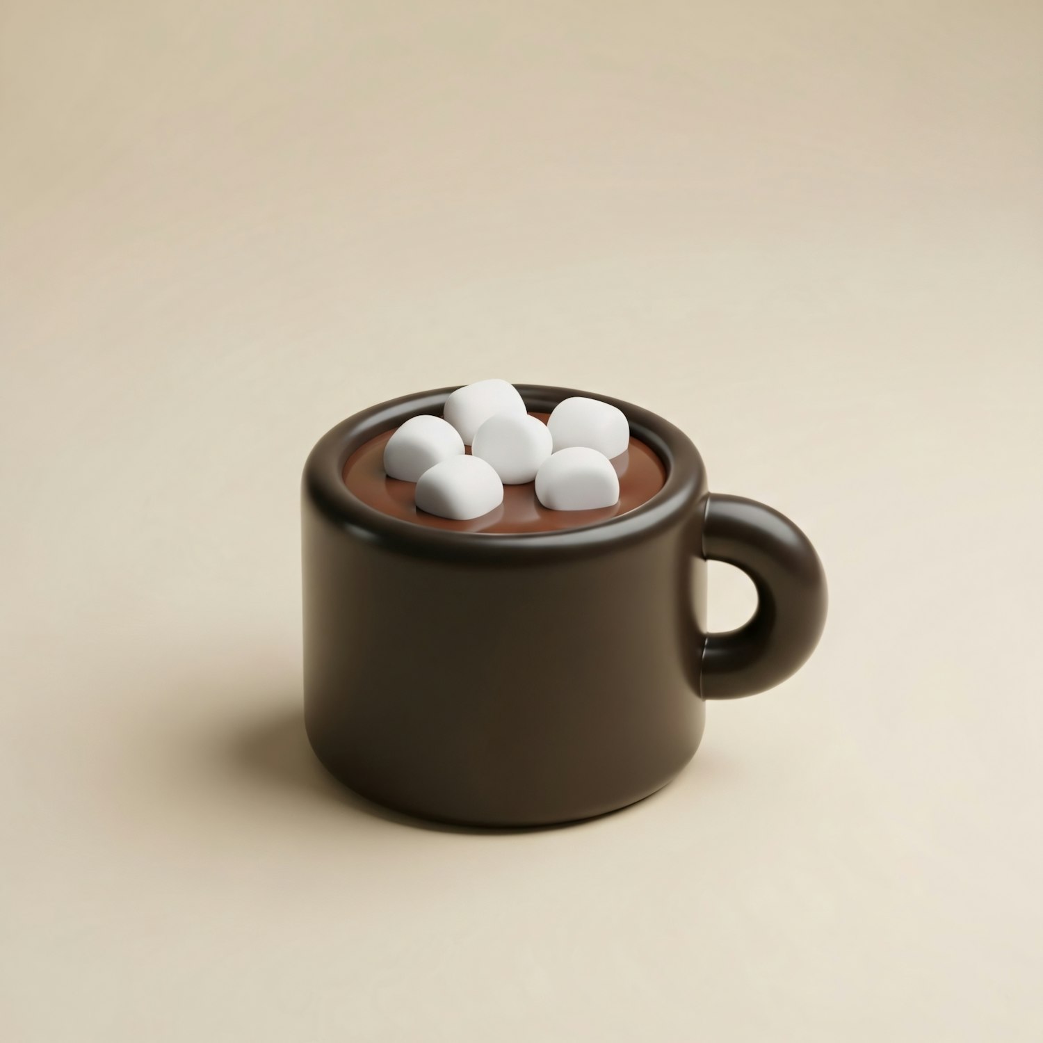 A 3D-rendered dark brown mug of hot chocolate topped with white marshmallows on a beige background, showcasing a cozy and inviting scene.