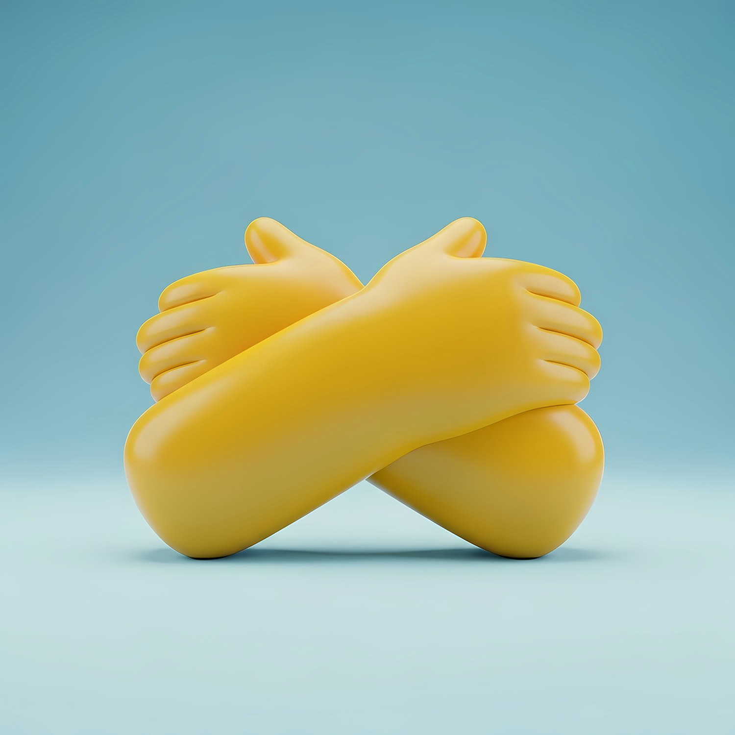 3D illustration of yellow hands crossing in a hug gesture on a light blue background, symbolizing care and connection.