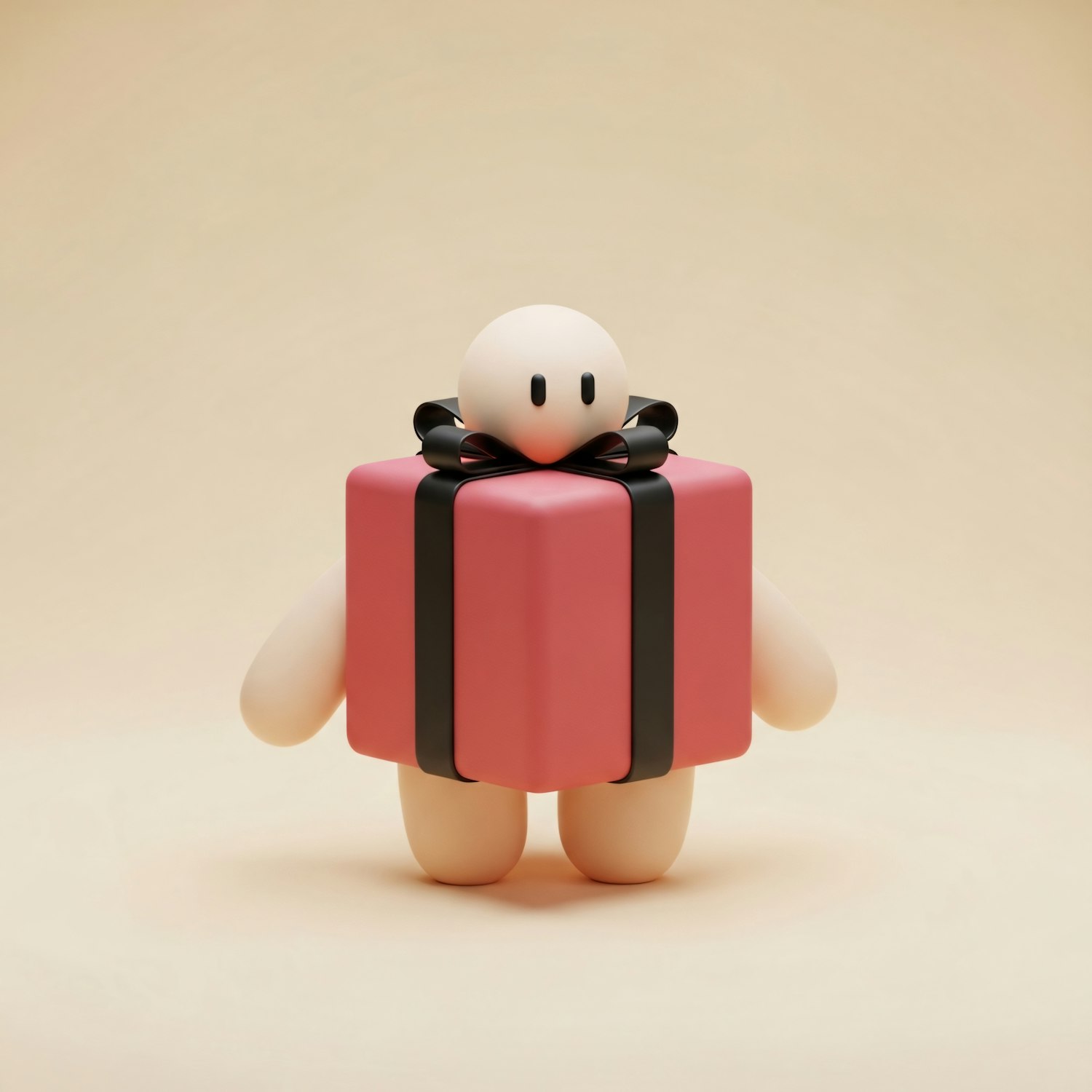 A cute 3D character holding a pink gift box with a black ribbon, set against a soft beige background.