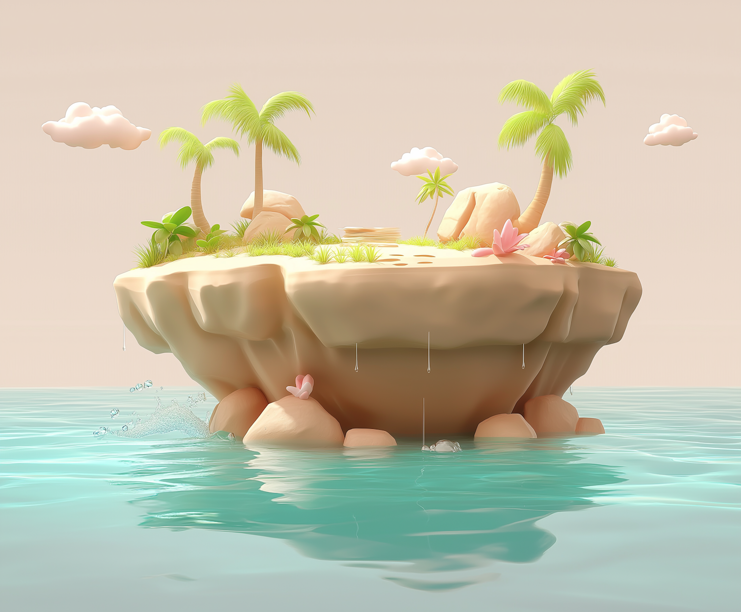 Whimsical 3D island with palm trees and turquoise waters, creating a serene and magical atmosphere.