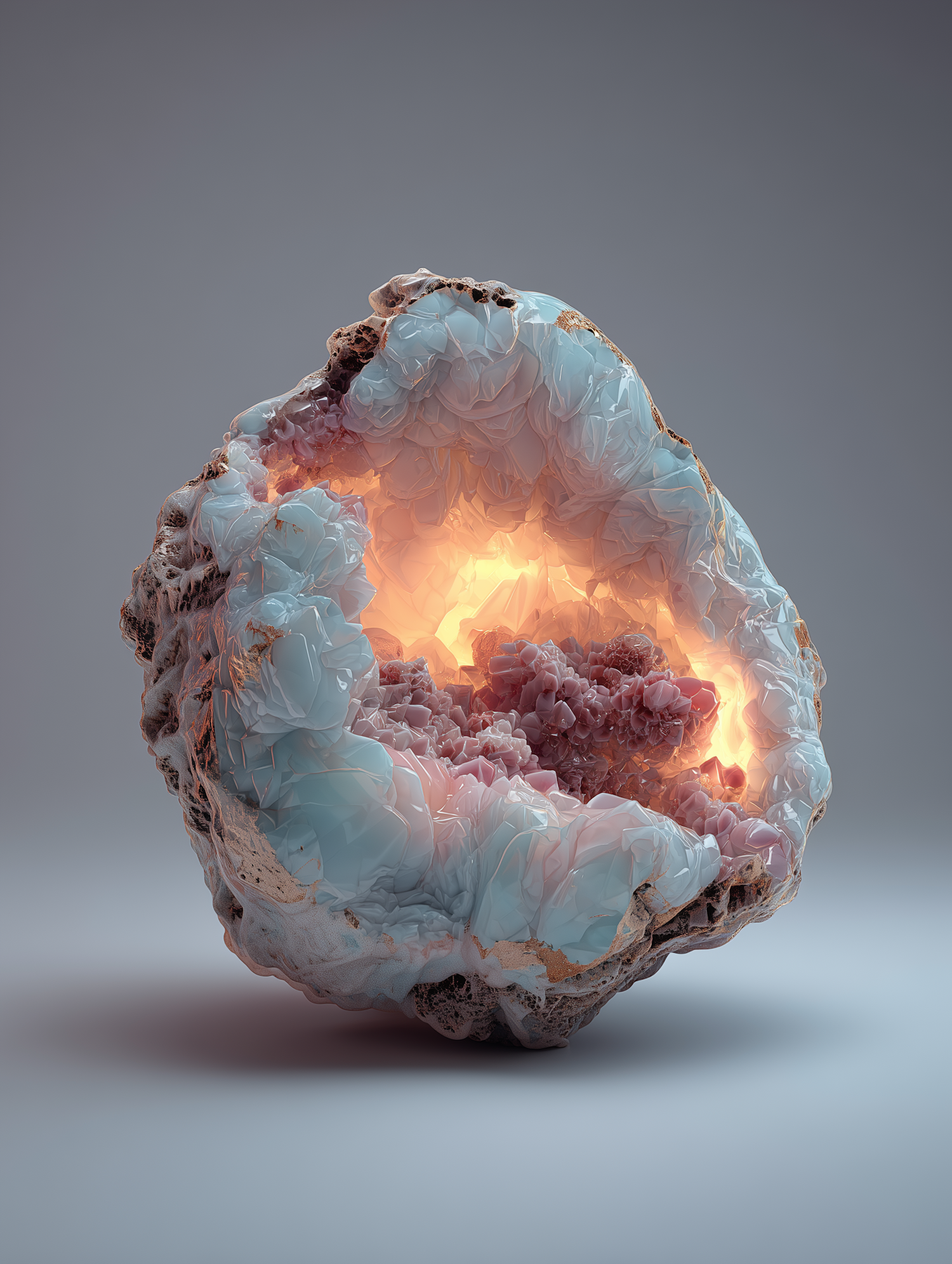 A glowing geode-like structure with intricate pink and white crystals, set against a neutral background for a striking visual effect.