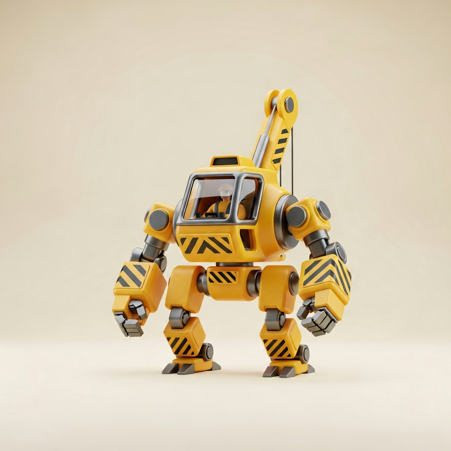 A 3D-rendered yellow and black robotic construction vehicle with a humanoid design, set against a neutral beige background.
