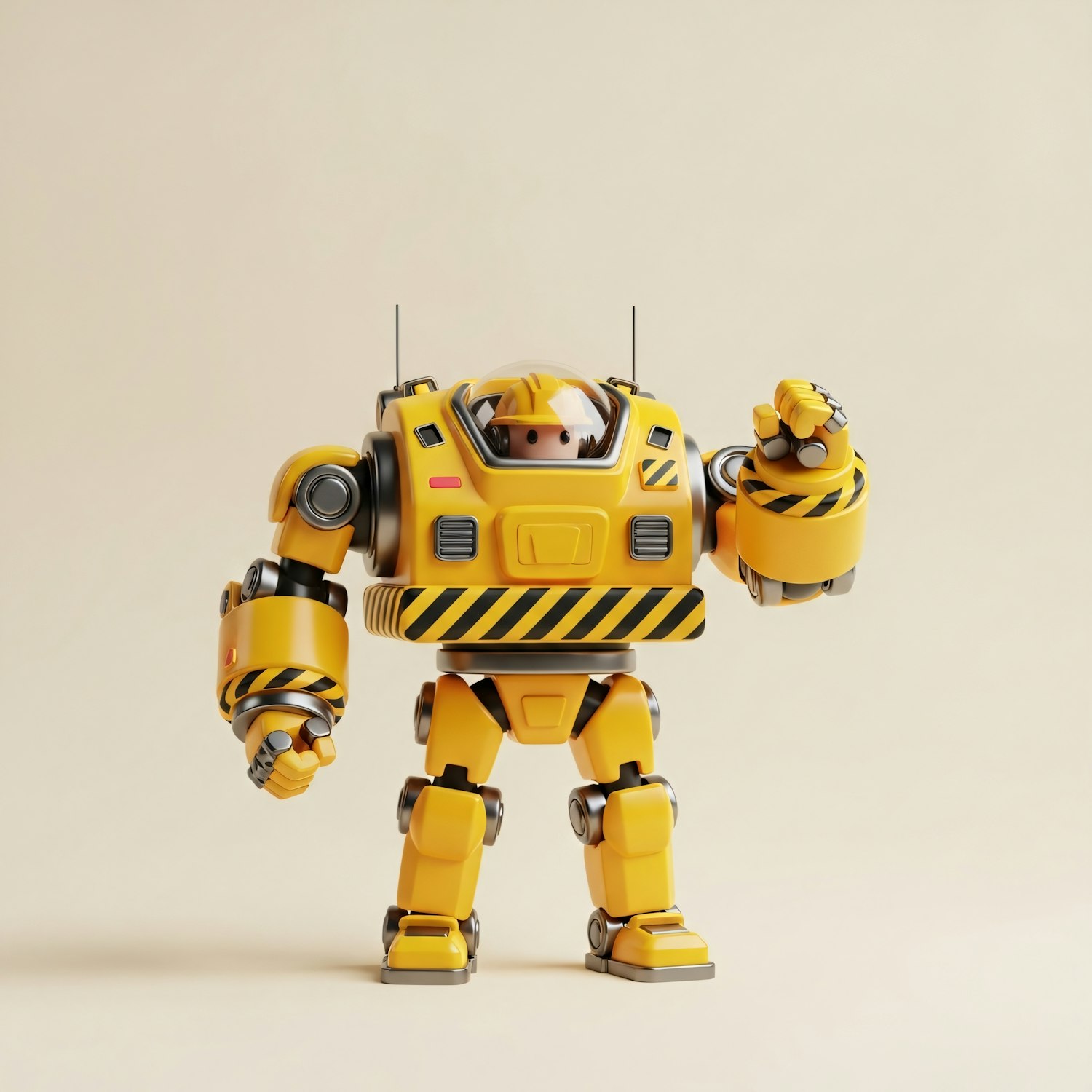 A yellow industrial-style robot with a cockpit and a small figure inside, standing against a neutral background.