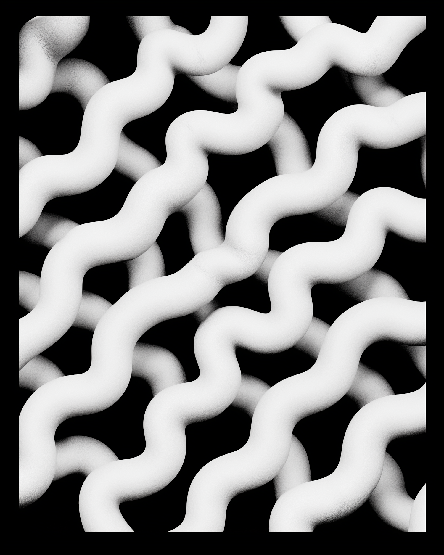 Abstract pattern of interwoven white wavy tubes on a black background, creating a striking monochromatic 3D effect.