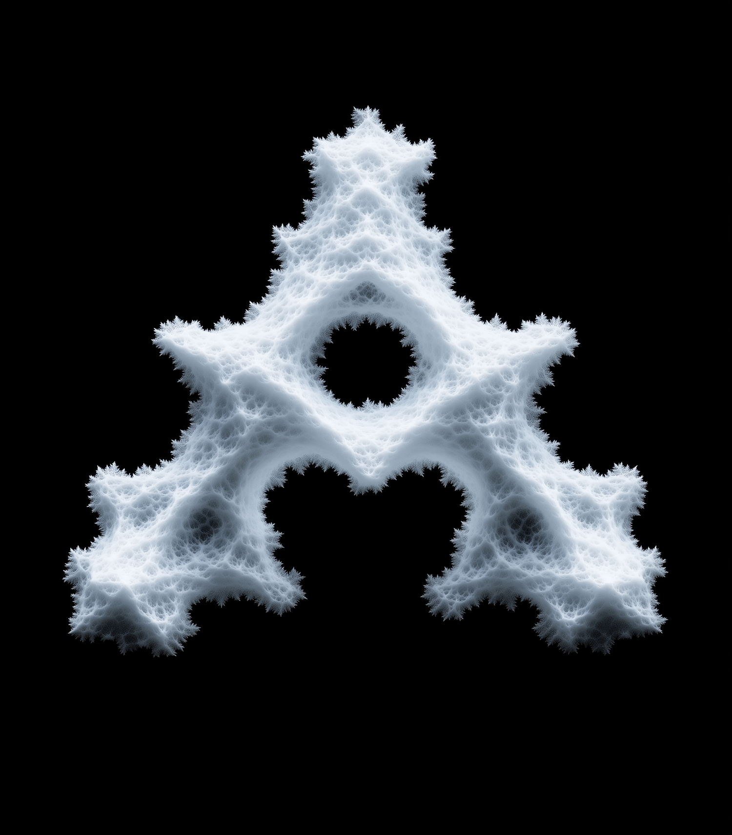 Intricate white fractal design with icy appearance on a black background, featuring complex branching patterns and a central circular opening.