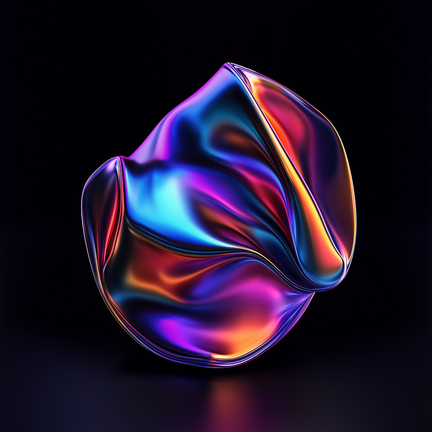 A stunning 3D abstract metallic object with iridescent colors and fluid curves, set against a deep black background.