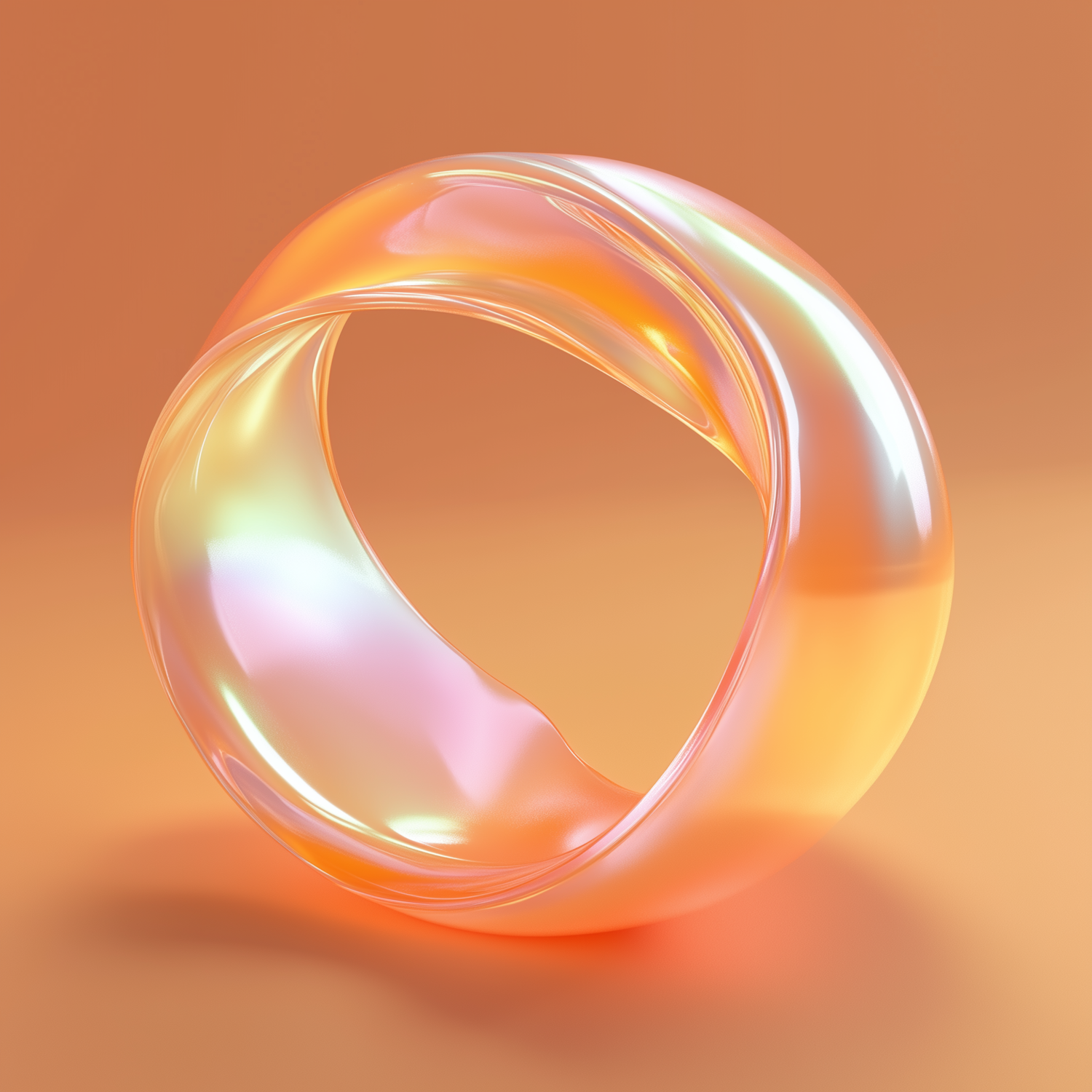 A glowing, iridescent 3D torus with fluid curves and vibrant colors on a warm orange background. Perfect for modern, abstract aesthetics.
