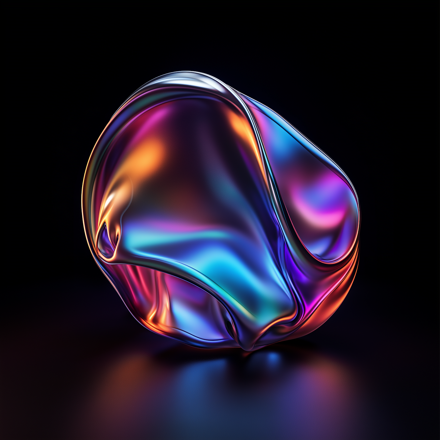 A stunning 3D abstract shape with iridescent colors and fluid metallic textures, glowing vividly against a dark background.
