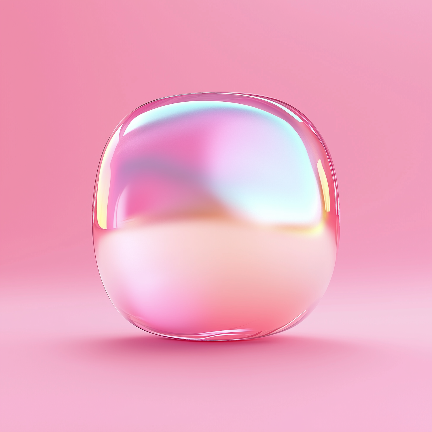 A glossy, pastel-colored rounded cube with an iridescent finish on a soft pink background, creating a dreamy and minimalistic vibe.