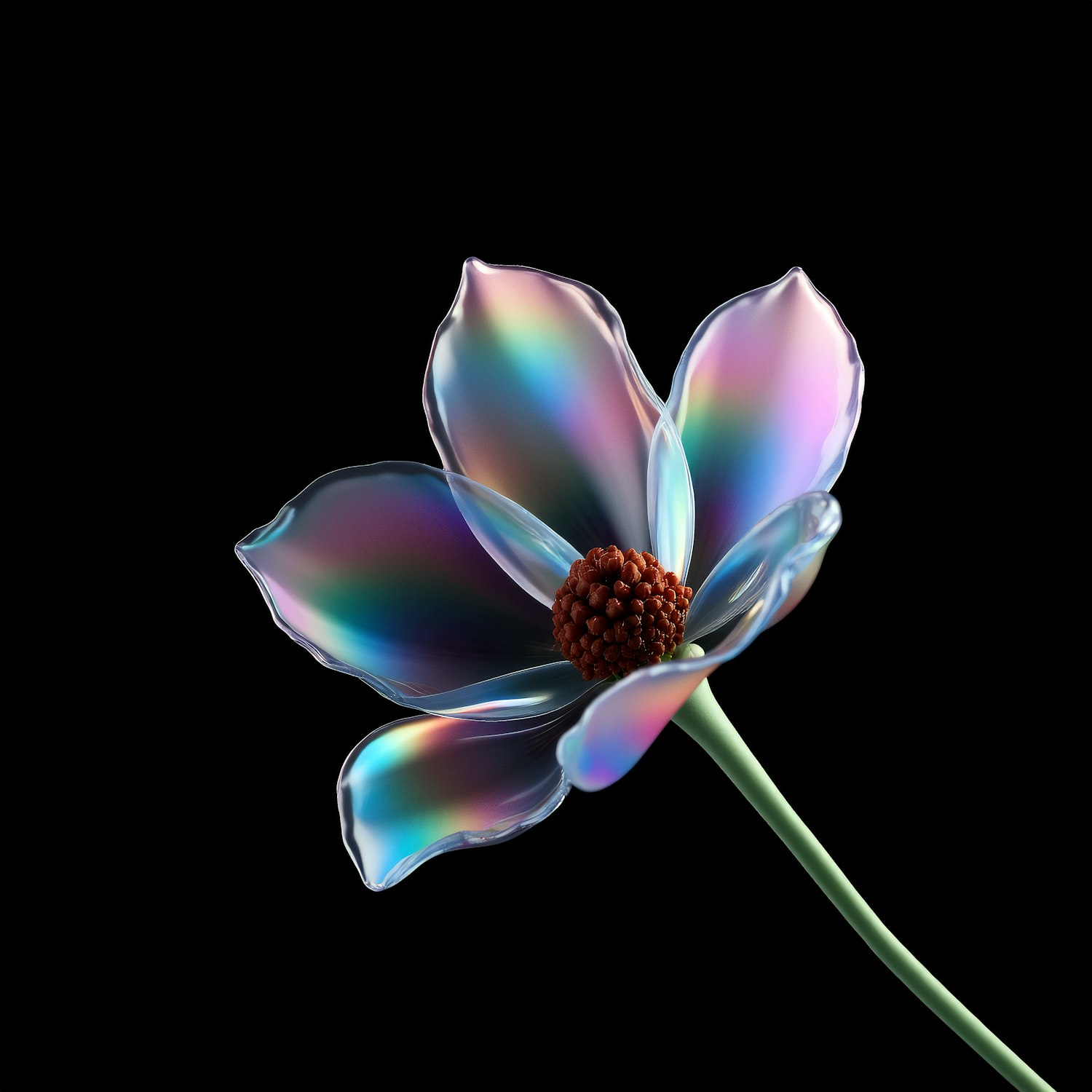 A digital artwork of a flower with iridescent, glass-like petals and a textured center, set against a black background.