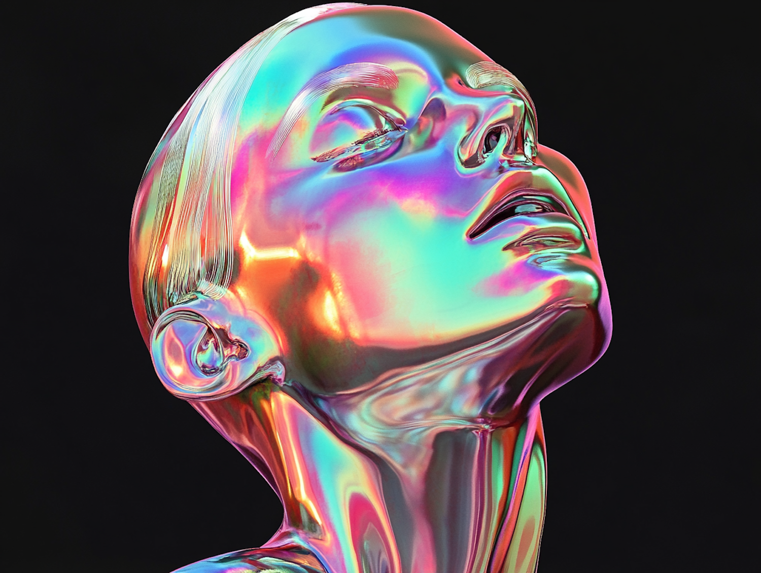 Vibrant 3D rendering of a metallic human head with iridescent colors against a black background.