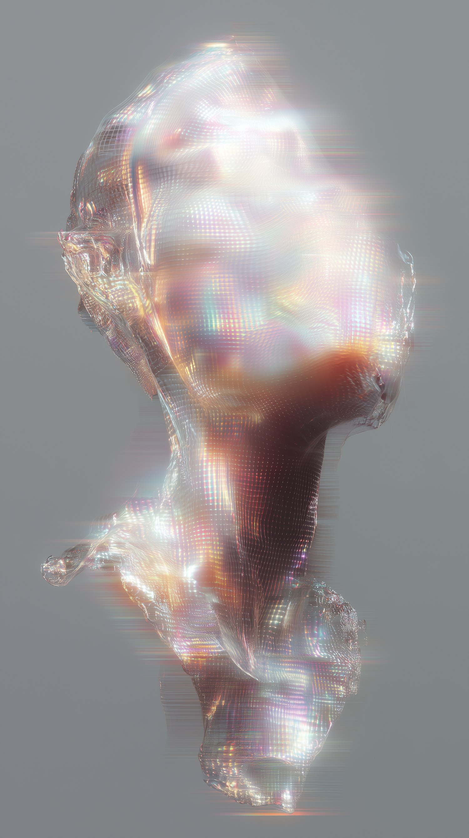 A stunning digital artwork of an iridescent, abstract humanoid form with a shimmering, mesh-like surface against a neutral background.
