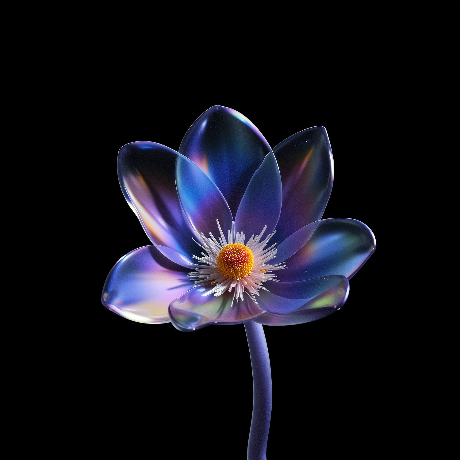 A 3D-rendered lotus flower with iridescent petals and a vibrant yellow center, set against a black background for a striking effect.