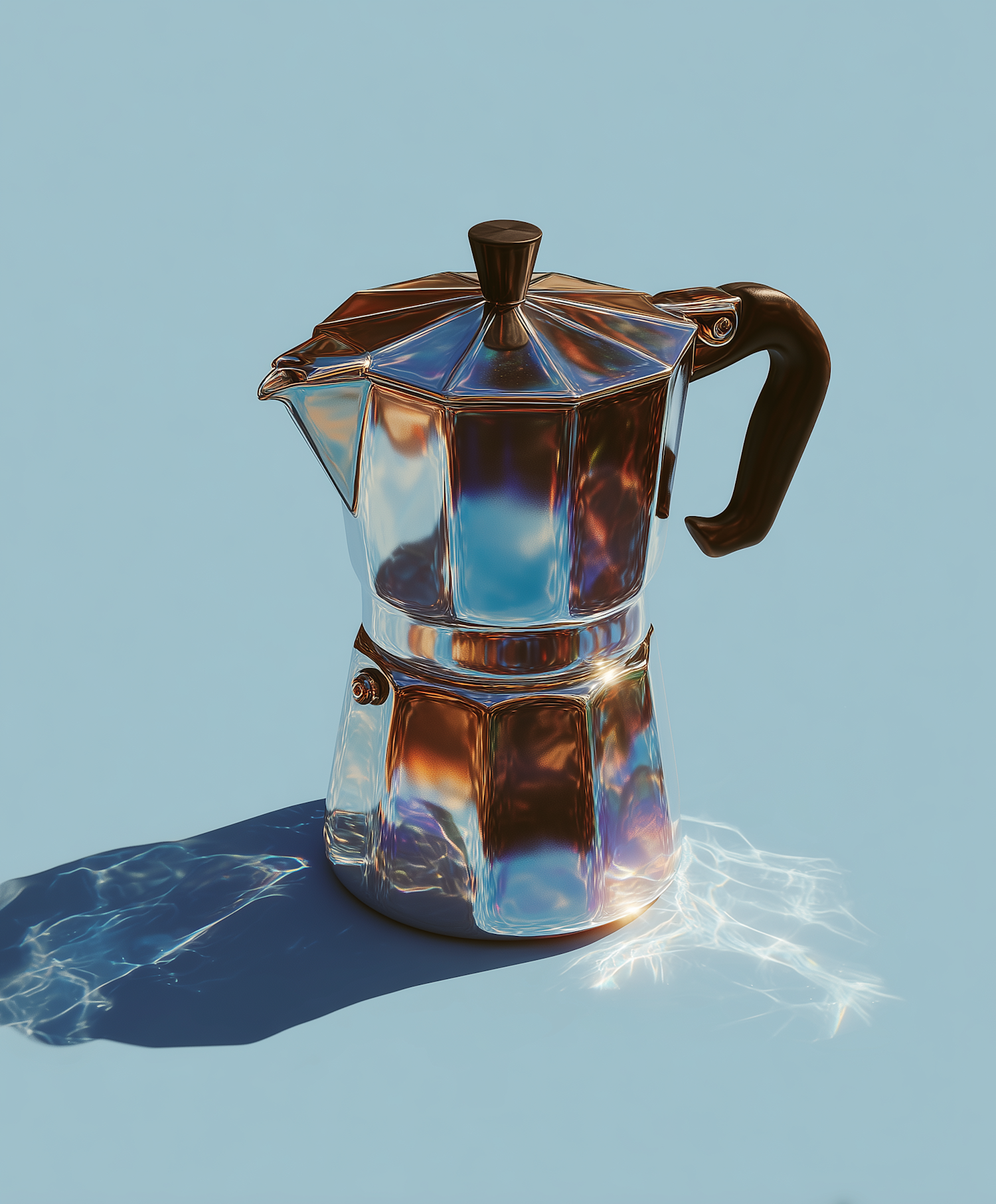 A shiny metallic moka pot with iridescent reflections sits on a light blue background, creating a vibrant and minimalistic composition.