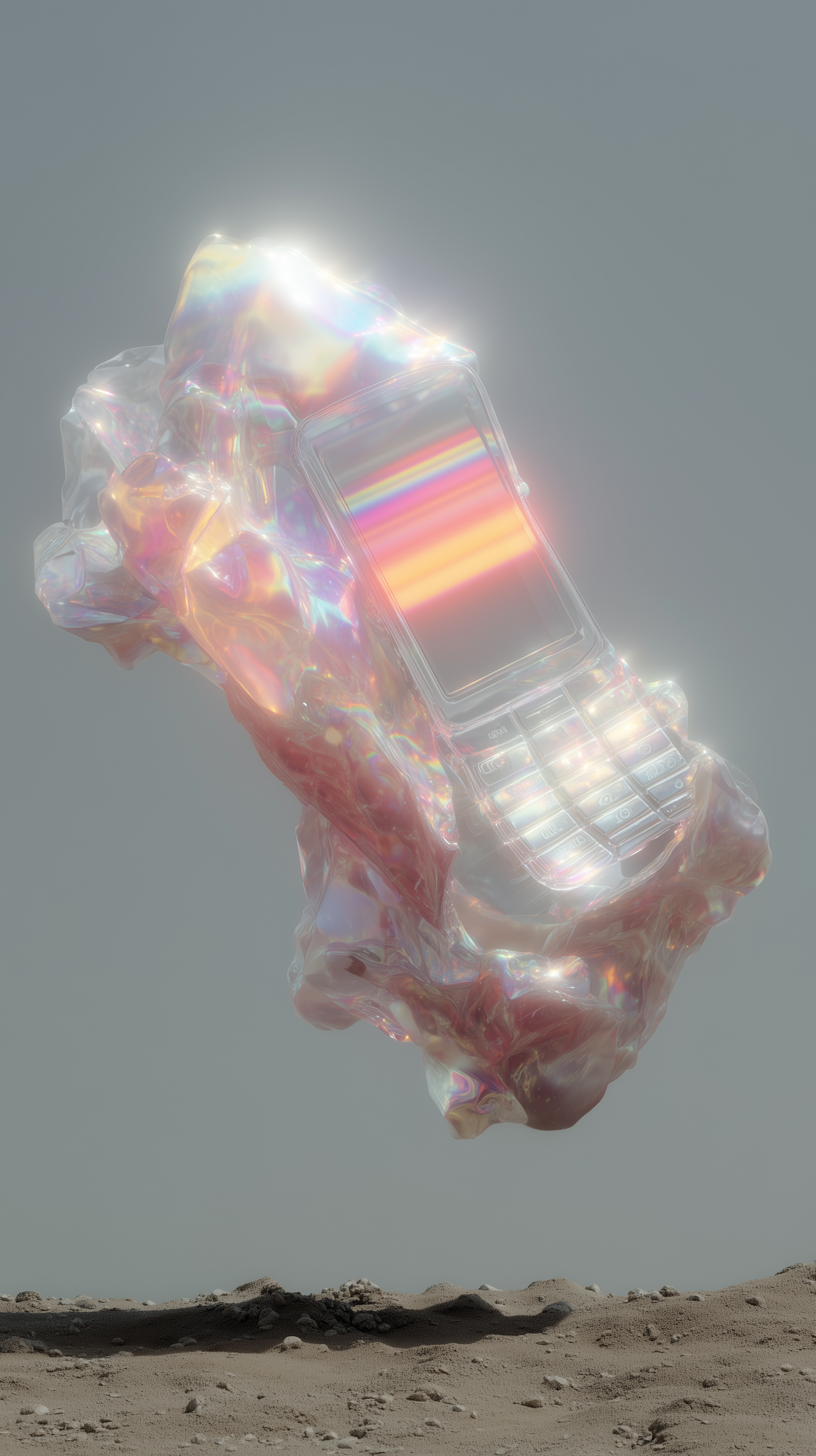 A glowing, iridescent phone-like object floats above a barren landscape, blending surrealism with futuristic design.