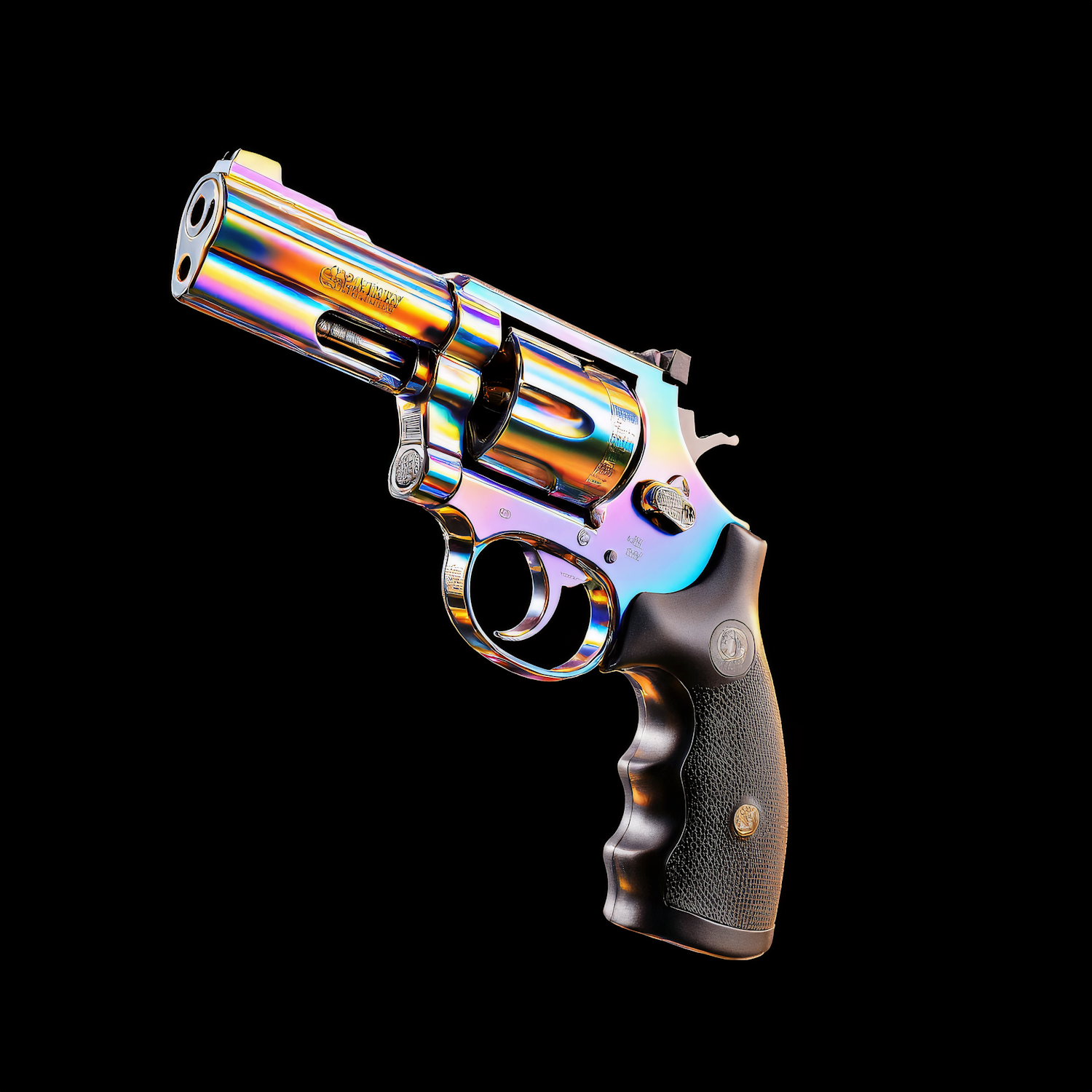 A revolver with a vibrant, iridescent finish and textured black grip, displayed against a black background, showcasing its craftsmanship.
