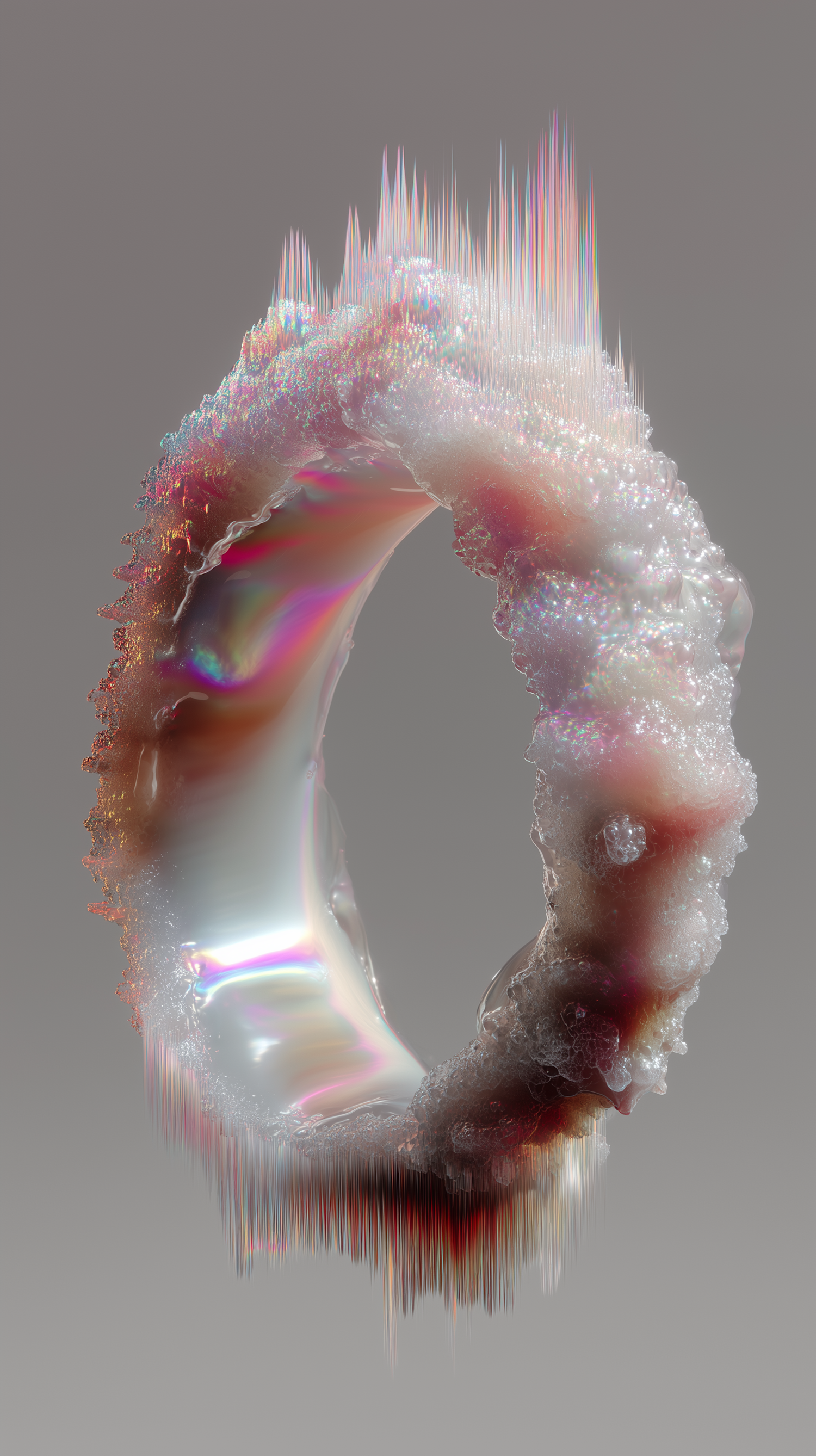 A stunning 3D-rendered iridescent ring with crystalline textures and vibrant colors on a neutral gray background.