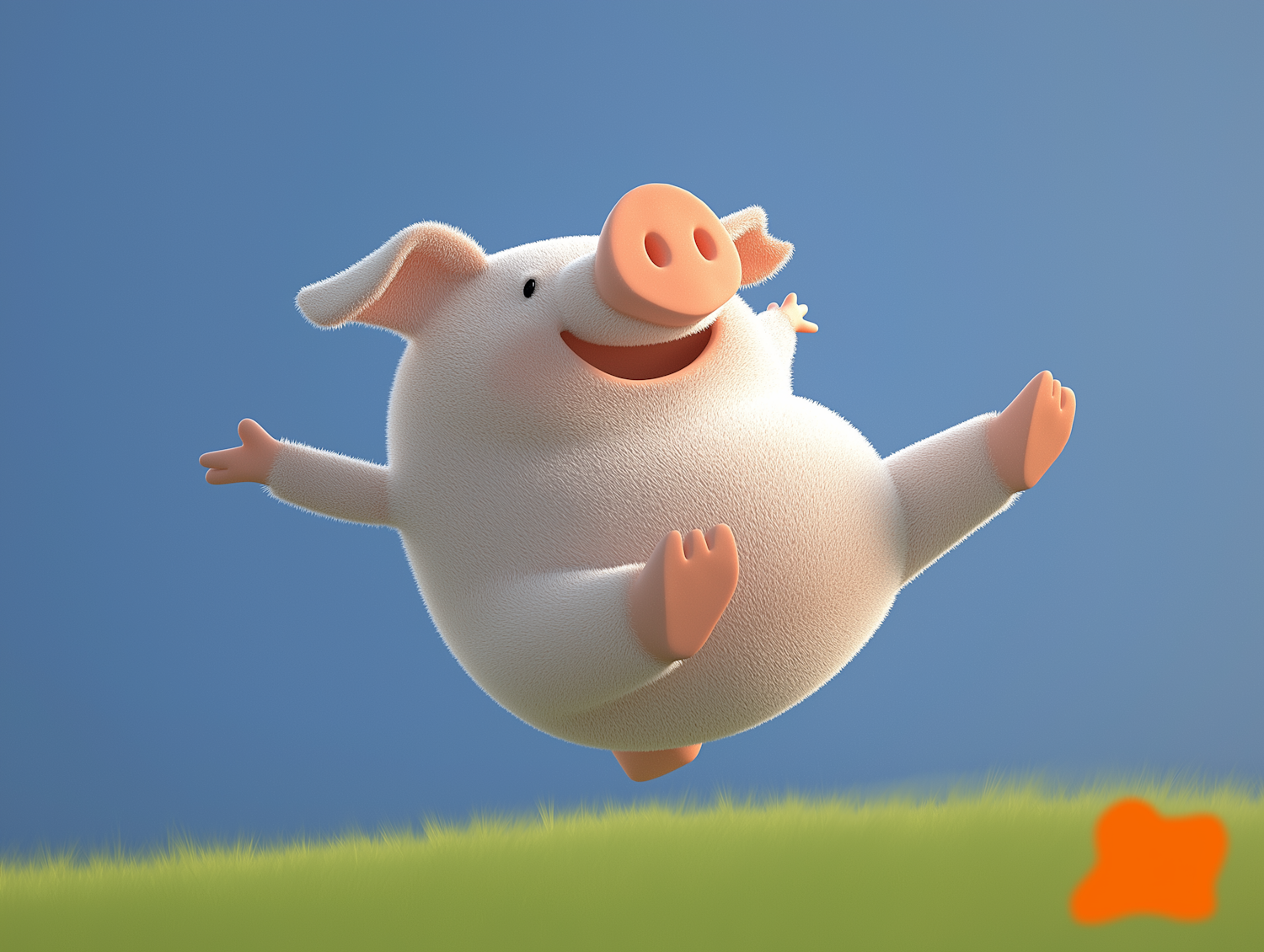 A cheerful cartoon pig jumps joyfully against a blue sky, with green grass below and an orange blob adding contrast.