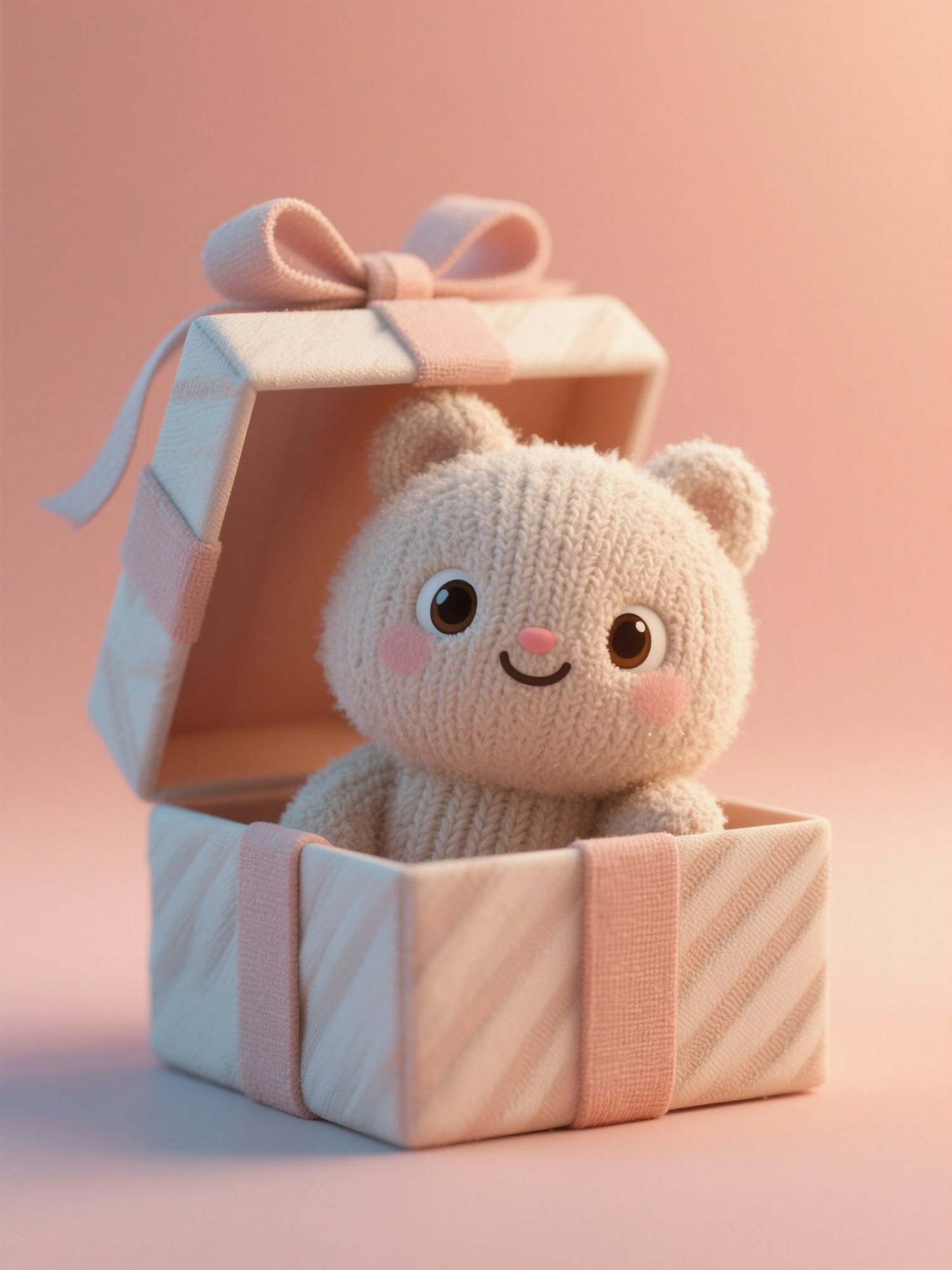 A soft 3D character made of plush or knitted fabric, with a cute cartoon face, peeking from a gift box, pastel coral background, hyper-realistic texture, Pixar style lighting, highly detailed and soft-focused render