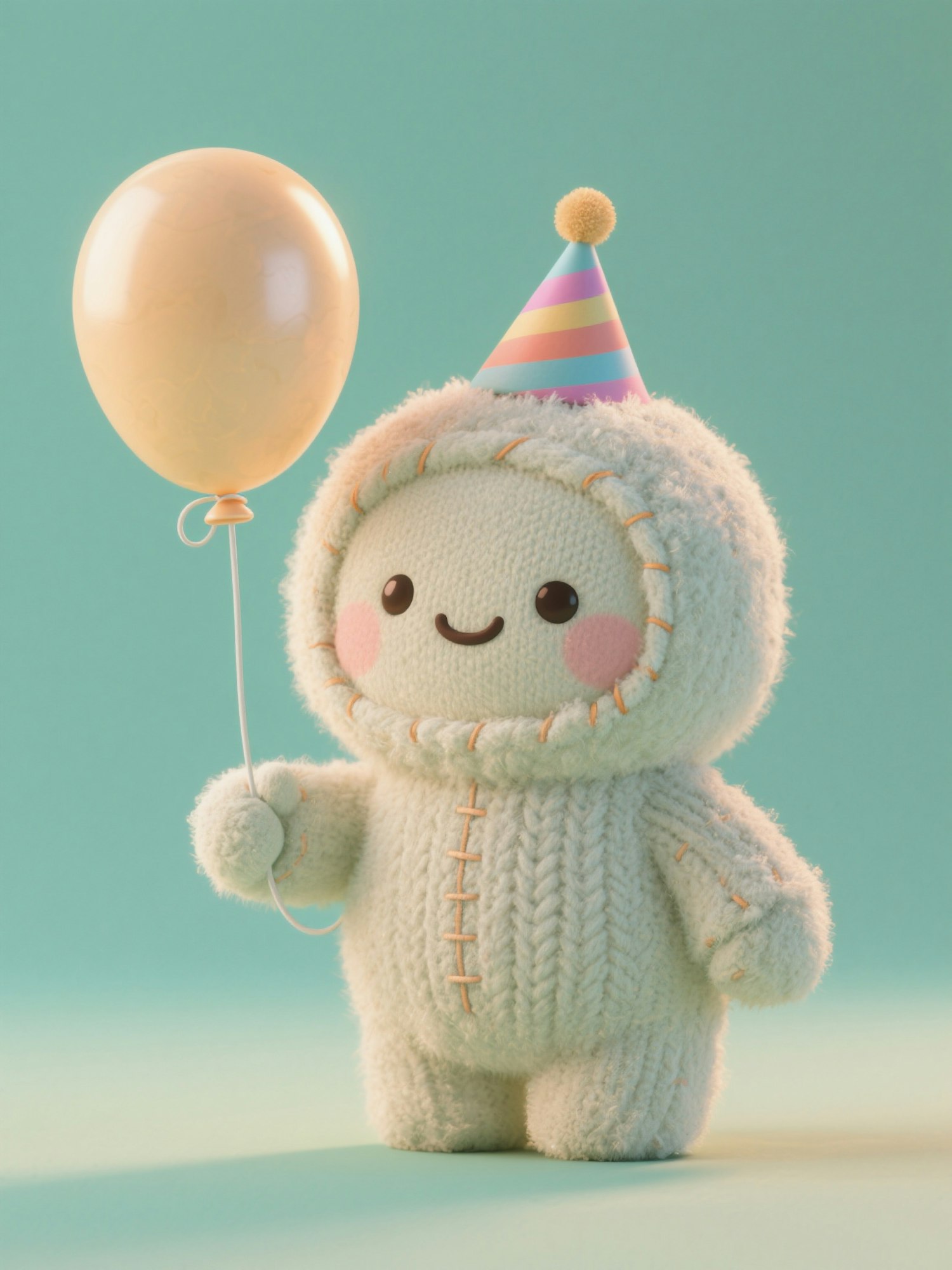 A soft 3D character made of plush or knitted fabric, with a cute cartoon face, wearing a tiny party hat and holding a balloon, pastel mint green background, hyper-realistic texture, Pixar style lighting, highly detailed and soft-focused render