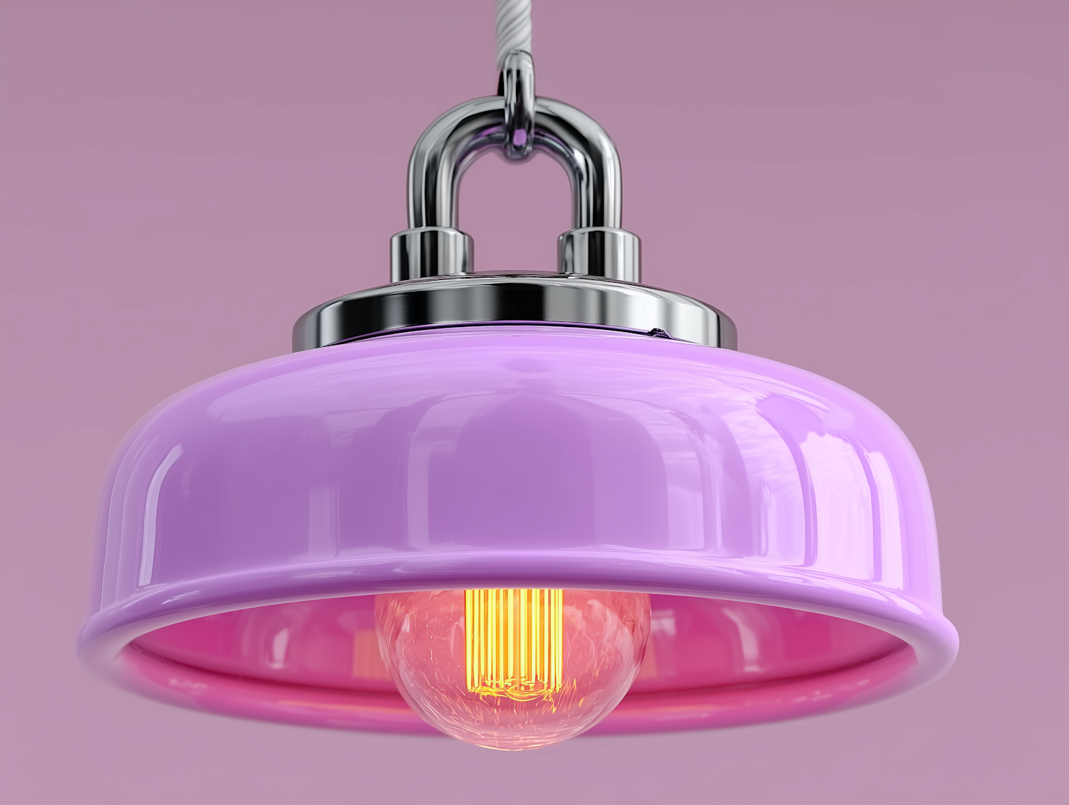 Modern lavender pendant light with chrome accents and warm glow, set against a soft pink background for a stylish aesthetic.