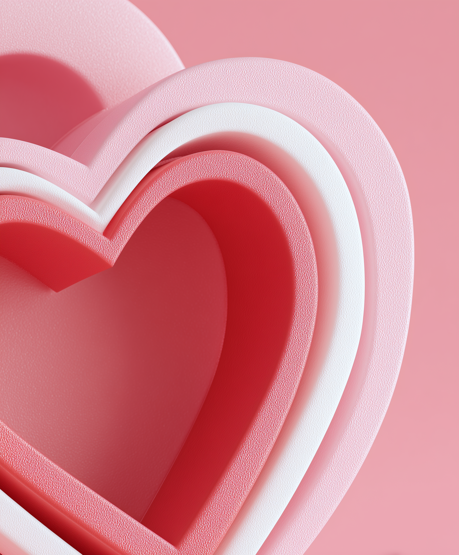 Layered pink and white heart shapes with a textured surface, arranged concentrically on a soft pink background.