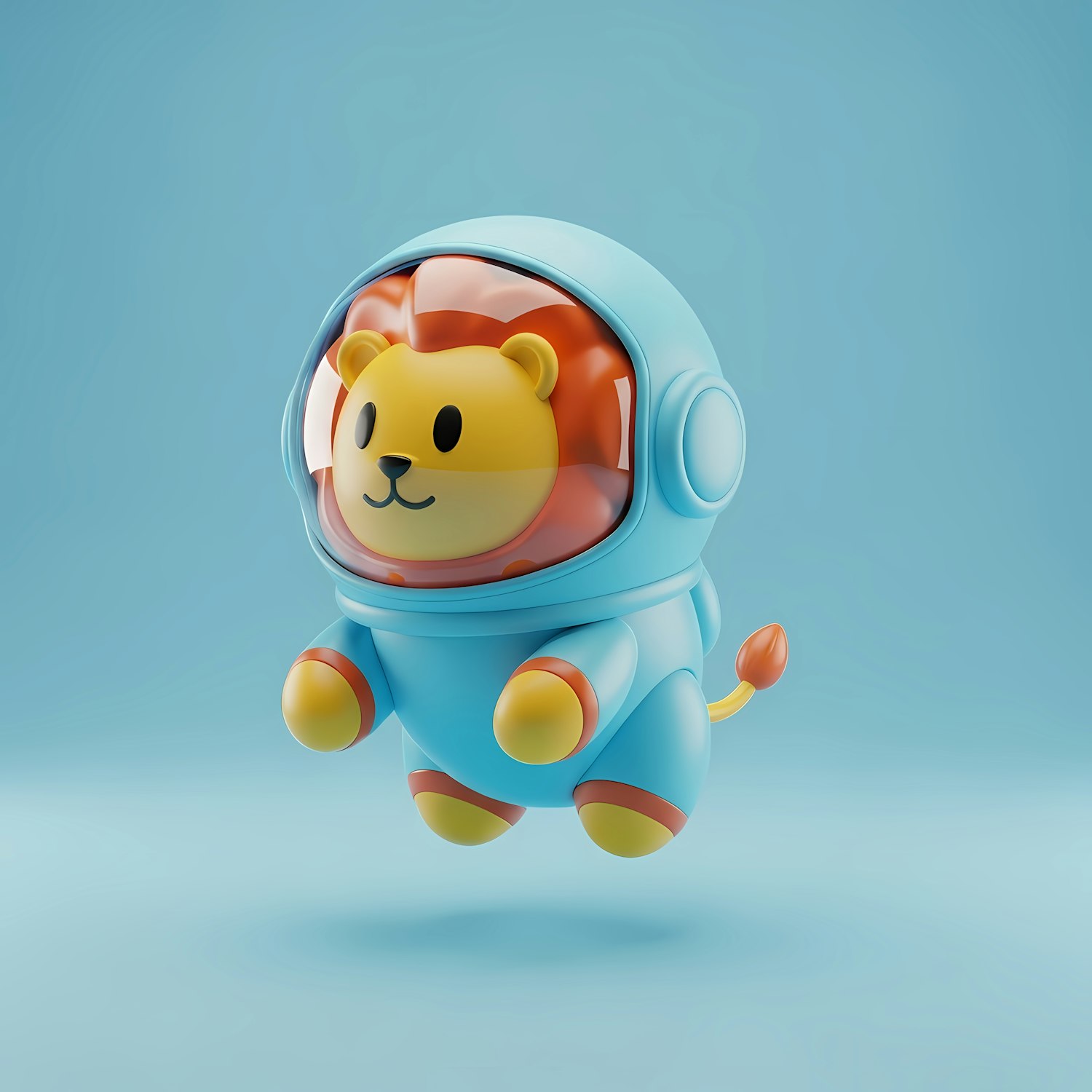 Adorable 3D lion in a blue astronaut suit with a transparent helmet, set against a light blue background. Perfect for kids' themes!