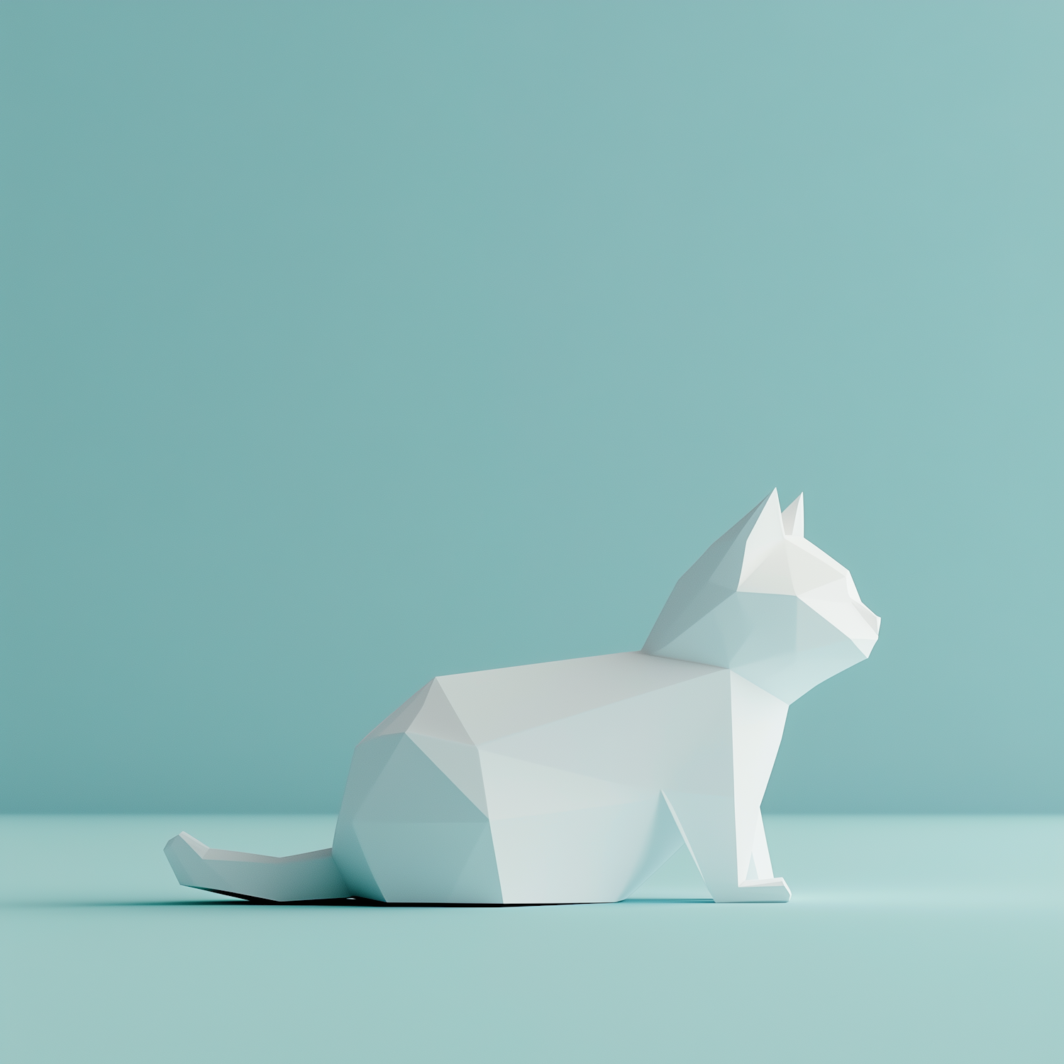 Minimalist low-poly 3D cat sculpture on a teal background, showcasing geometric design and modern aesthetics.